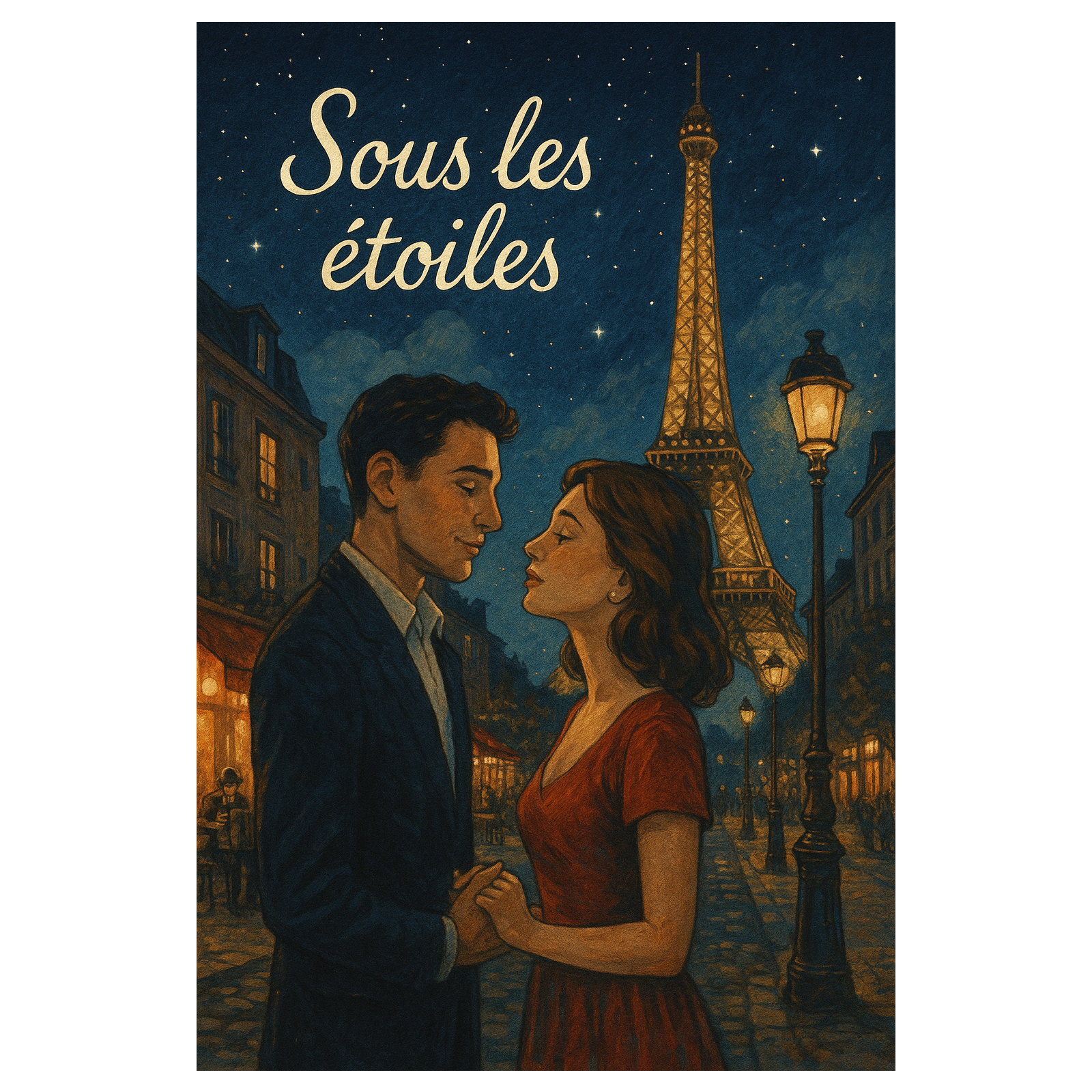 Create a romantic French chanson with light jazz-pop influence, Style: French chanson, jazz-pop, cinematic, Mood: dreamy, romantic, warm, like a walk through Paris at night under the stars, Instruments: soft acoustic guitar, upright bass, gentle piano, accordion, light jazz drums with brushes, subtle strings, and warm saxophone fills, Vocals: male & female French vocals, smooth, tender, with emotional harmonies, Verses should be calm and intimate, choruses brighter and melodic, like an open embrace, Atmosphere: cozy cafés, quiet streets, glowing lampposts, lovers walking under moonlight, Lyrics in French (romantic, poetic, simple) about love, Paris at night, and singing together until morning, Hook line in chorus: “Sous les étoiles, je t’attends” (Under the stars, I wait for you), Overall feel: cinematic and timeless, like an old Parisian love song blended with modern jazz-pop warmth