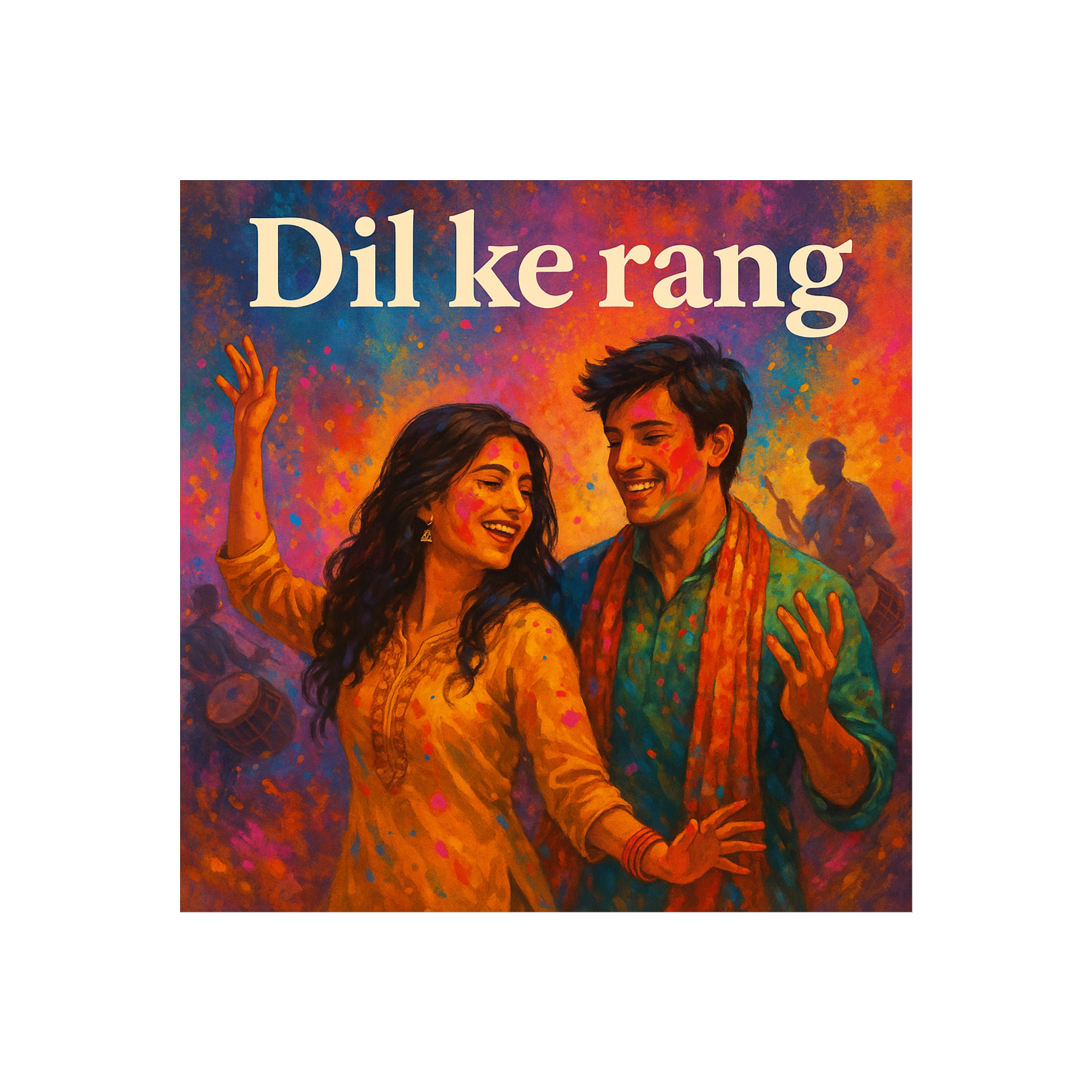 Create a vibrant Bollywood fusion track with traditional Indian instruments mixed with modern pop production, Style: Bollywood, world music, electro-pop fusion, Mood: colorful, festive, romantic, full of life and dance energy, Instruments: sitar melodies, tabla and dhol rhythms, bright synths, electronic bass, upbeat drums, and cinematic strings, Vocals: male & female Hindi singers, emotional, expressive, with layered harmonies; some English phrases for a modern crossover vibe, Verses should feel dreamy and romantic, while choruses burst with joyful energy, like a Bollywood dance sequence, Atmosphere: festival of colors (Holi), lights, dance, and celebration of love, Lyrics in Hindi (with some English lines) about the “colors of the heart, ” love that fills life with brightness, dreams, and rhythm, Key chorus line: “Dil ke rang, saath mere sang, naache jahan ye dhadkane, ” Overall sound: cinematic, uplifting, like a modern Bollywood hit blending tradition with pop