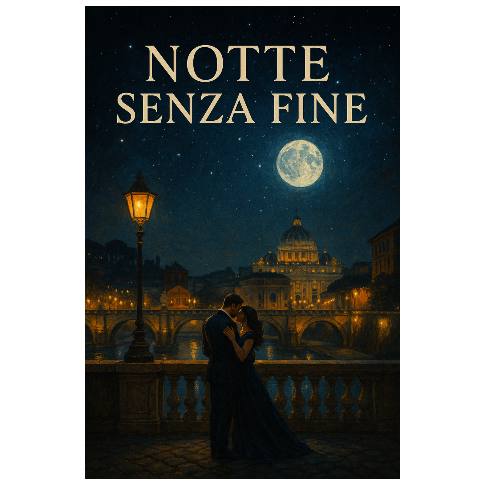 Create a romantic Italian orchestral pop ballad with cinematic emotion and passion, Style: Italian pop ballad, orchestral, cinematic, Mood: dramatic, romantic, timeless, like a love story under the Roman night sky, Instruments: grand piano, warm acoustic guitar, sweeping orchestral strings, deep bass, gentle percussion (timpani, soft drums), subtle harp, and emotional brass swells, Vocals: male Italian lead, rich and emotional, with strong vibrato and soaring delivery in the choruses; optional female backing harmonies for depth, Verses should feel intimate and tender, choruses powerful, dramatic, and cinematic, Atmosphere: the streets of Rome at night, church bells, eternal love under the stars, Lyrics in Italian (romantic, poetic, cinematic) about endless night, destiny, and love as an eternal flame, Key chorus line: “Notte senza fine, luce d’amore, tu sei la fiamma nel mio cuore, ” Overall sound: epic and heartfelt, blending classical Italian ballad style with cinematic orchestral gra