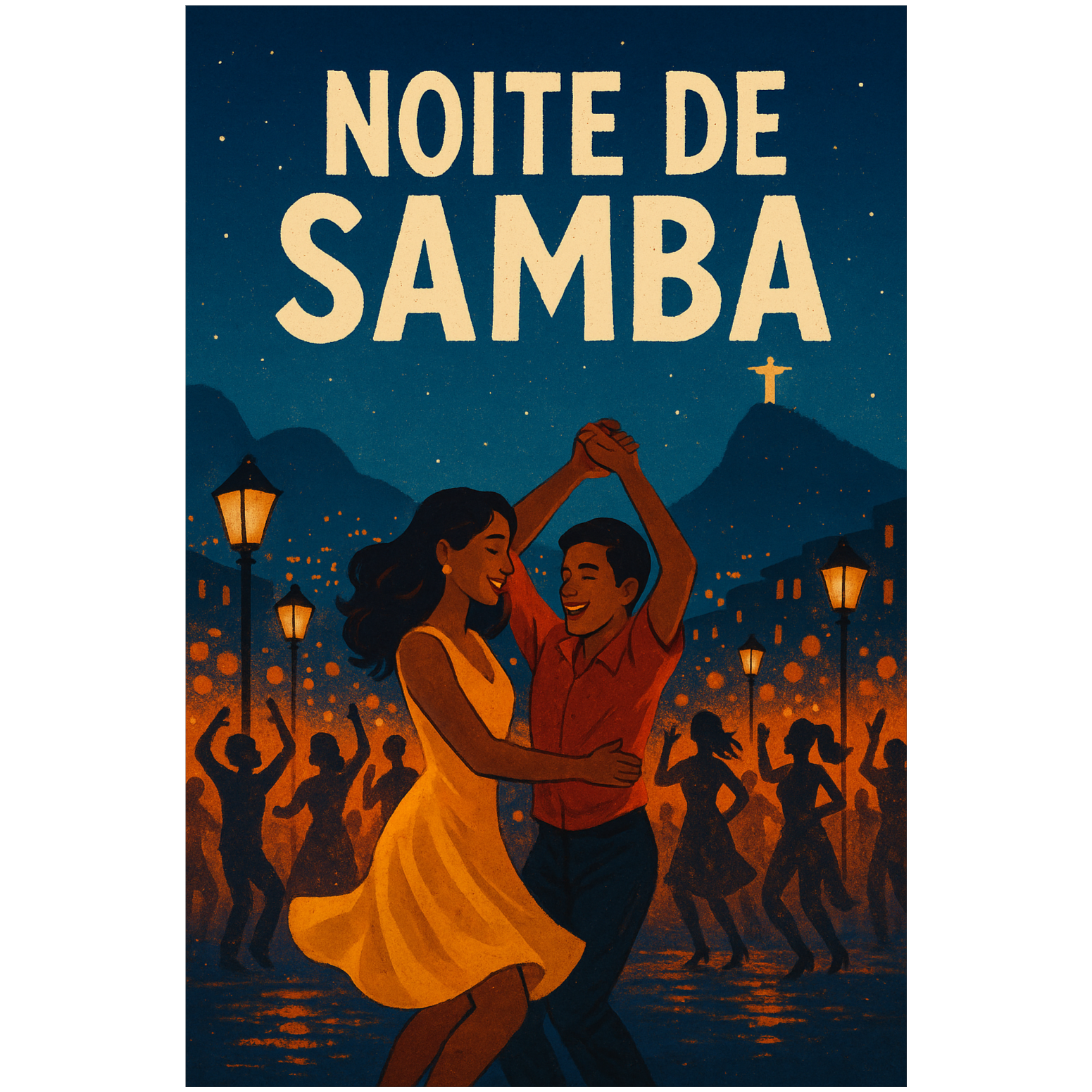 Create a vibrant Brazilian samba-pop track with festive energy, blending samba and bossa nova, Style: samba, bossa nova, Latin pop, Mood: joyful, warm, full of rhythm, like a street carnival in Rio at night, Instruments: acoustic guitar with samba rhythms, cavaquinho, pandeiro, tamborim, surdo, hand percussion, groovy bass, brass section (trumpet, trombone, saxophone), and festive claps, Vocals: male & female Portuguese vocals, expressive, playful, with call-and-response lines, Verses should feel smooth and romantic, choruses energetic and anthemic, like everyone singing together in the street, Atmosphere: moonlit Rio, dancing crowds, glowing lanterns, colorful carnival vibe, Lyrics in Portuguese about dancing samba under the night sky, love, passion, and joy of life, Key hook line: “Noite de samba, vem comigo, coração batendo no mesmo ritmo, ” Overall sound: cinematic, uplifting, and festive — like a modern samba anthem that makes everyone dance