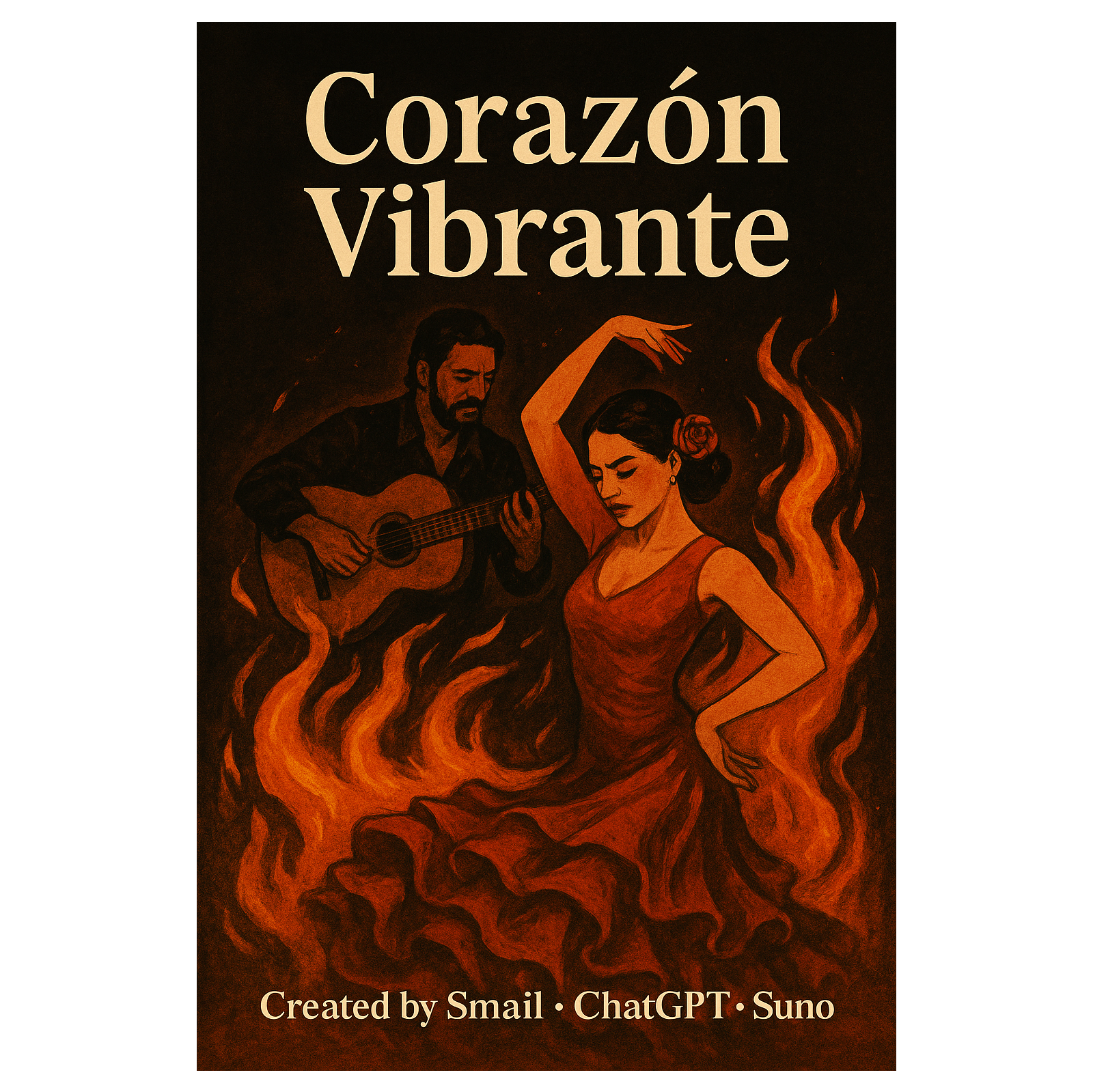 Create a passionate flamenco-inspired song with modern Latin pop elements, Focus on rhythmic Spanish guitar, handclaps (palmas), castanets, dramatic strings, and powerful male vocals, The atmosphere should evoke the heat of a Spanish night, the energy of dance, and the storm of emotions, Lyrics in Spanish, filled with metaphors of passion, destiny, rhythm, and intensity, avoiding any references to fire or flames, The chorus should be memorable and dramatic: “Corazón vibrante, baila en la noche, luz que resuena, nunca se esconde…”, The mood is romantic, intense, and dramatic, blending traditional flamenco spirit with a modern Latin world sound, Styles: flamenco, latin pop, world