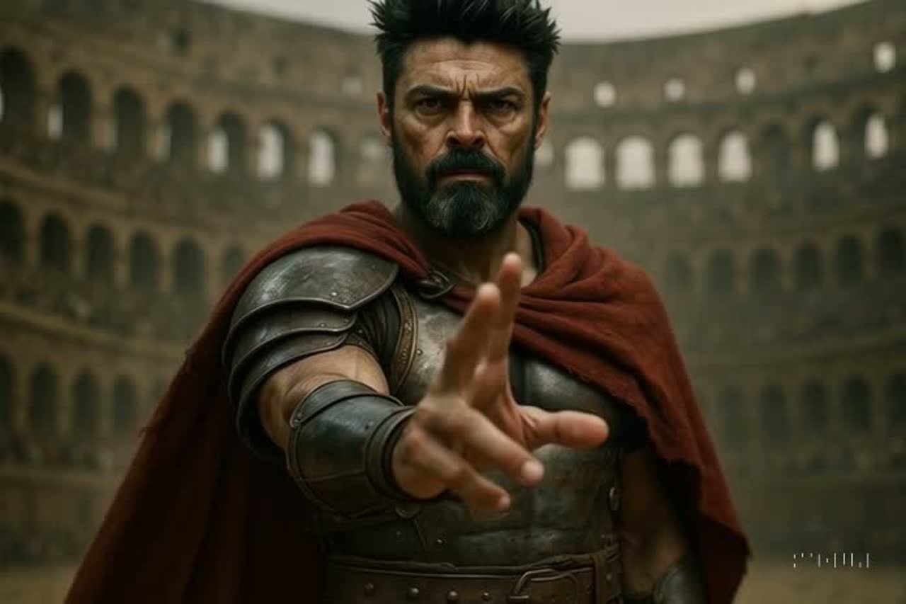 Malakayi, The song launches with triumphant brass fanfares heralding the gladiators’ entrance into the arena, then erupts into thunderous war drums, taikos, metallic strikes, and battlefield ambience layered with deep toms and shakers, Imperial martial rhythms surge beneath Aeolian/Dorian folk flutes, war horns, and lyre drones, Guitars cut through with mid-heavy pagan crunch, tremolo melodies, and heroic octave leads, Commanding vocals lead bold ritual chants, dramatic clean belts, choir call-and-response, and harsh shouts, intensified by heroic male choirs echoing ancient arenas, Brutal martial industrial accents—chain impacts, stomps, sand on steel—merge with swelling orchestral brass, dark strings, and epic crescendos, all awash in massive reverb, forging a mythic and triumphant Roman war hymn, dramatic key change in final chorus