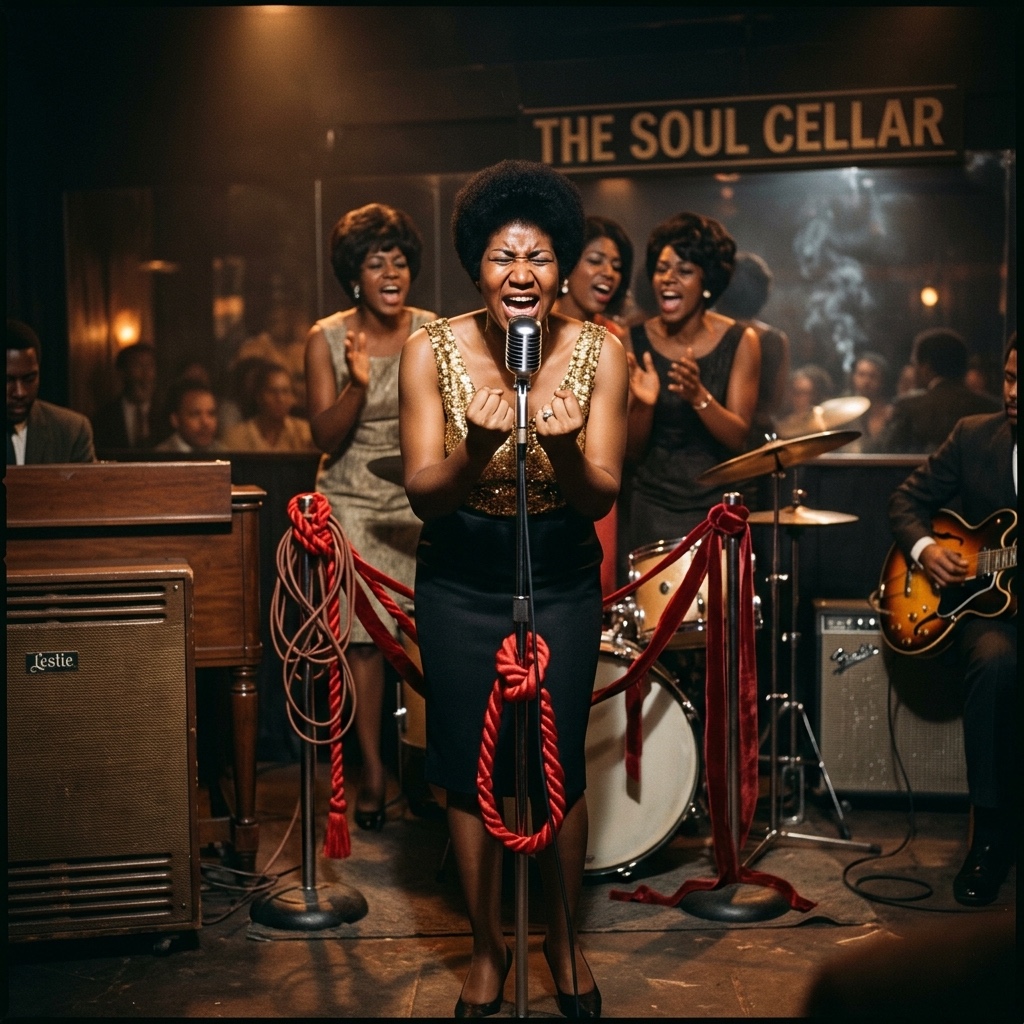 1967 gritty, gospel-rooted vocals & a driving, bluesy groove, features iconic opening tremolo guitar, piano glissandos & Hammond organ fills to accentuate emotional peaks, features a walking bass line & a firm backbeat, powerful black female vocals belting, gospel-rooted phrasing, & deep emotional vulnerability within a bluesy, gritty tone, & utilizing her entire vocal range to express frustration, blending bluesy blue notes with precise pitch control while supported by backing vocals echoing single words or phrases in a church-like call-and-response style, a distinct, laid-back yet intense groove driven by the Muscle Shoals Rhythm Section, essentially a soul song that utilizes a one-chord, minor blues formula to create a sense of longing & frustration, long intro, catchy, melodic, memorable