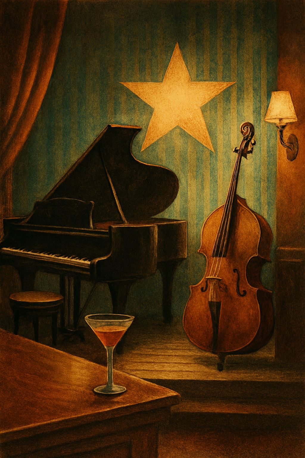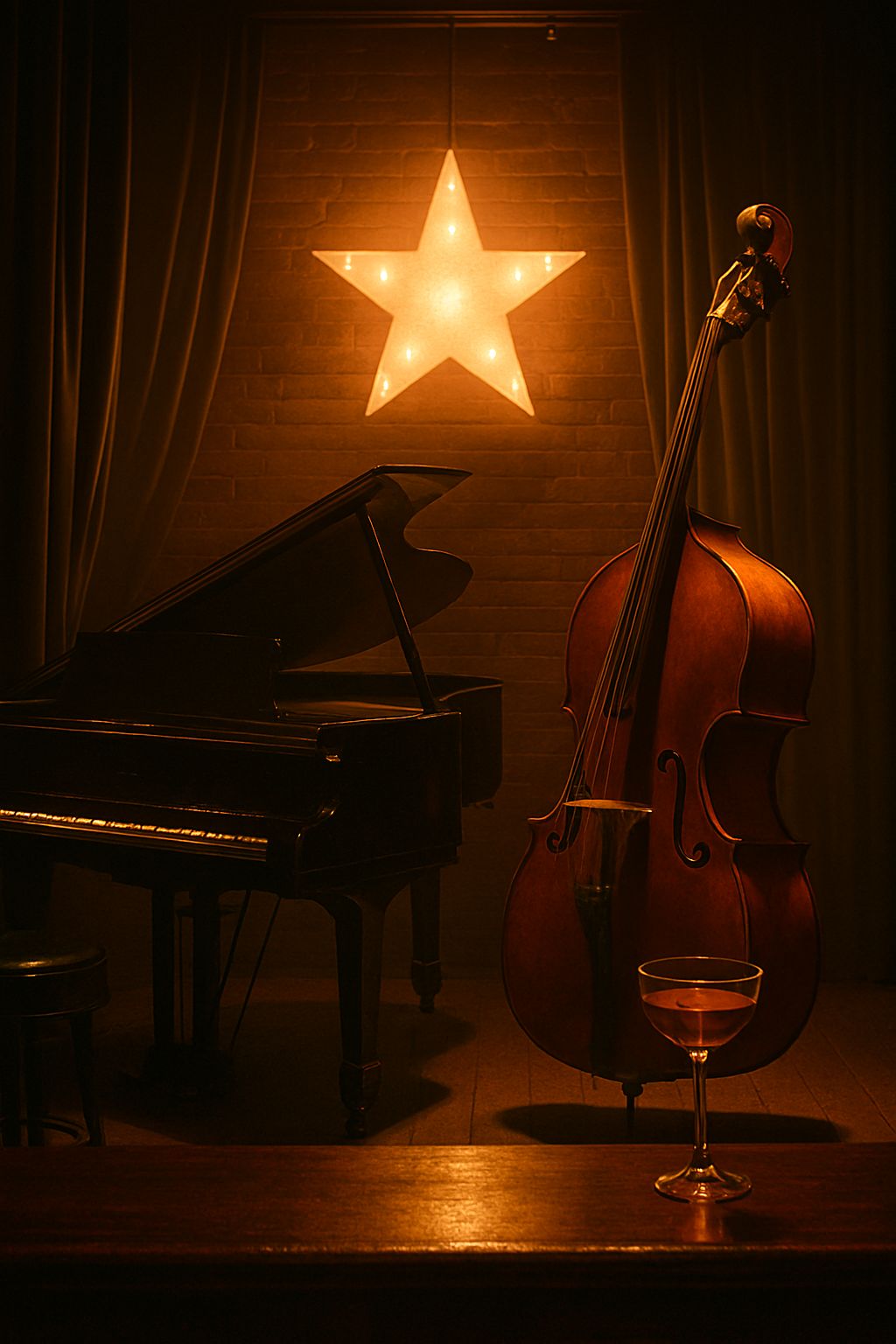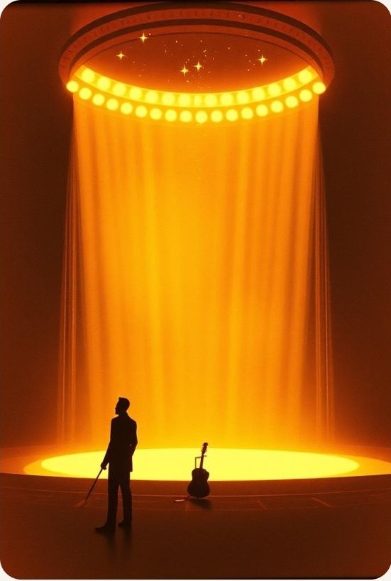 sad vintage crooner style, 1940s-1950s vibe, slow mid-tempo waltz, black blues roots rock and roll, warm analog tape sound, upright bass, brushed drums, jazz guitar, piano swing, deep raspy low blues male vocal, slight slapback echo, gospel backing vocals, emotional and nostalgic mood, live room reverb, RCA44 vintage microphone tone, smooth sax solo, soft trumpet, smoky atmosphere, intimate club vibe#Hook image: 1950' bar ambiance_ yellow stars shape_realistic style detail