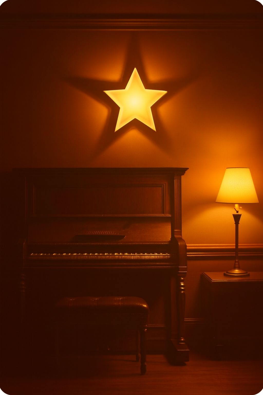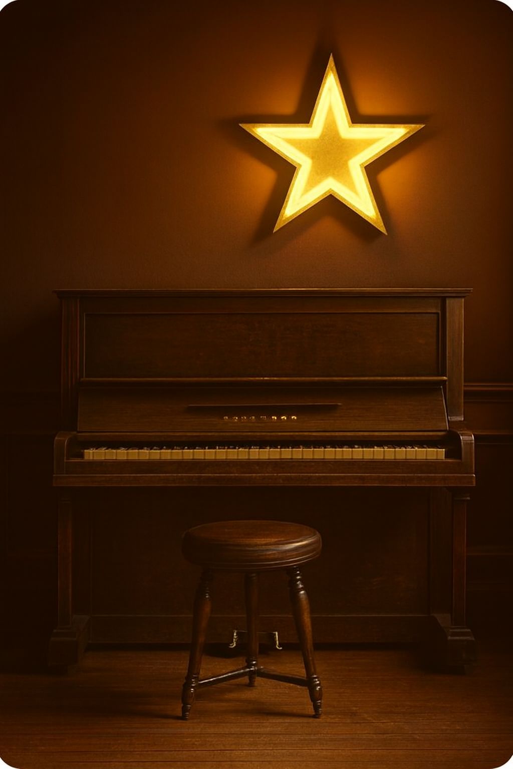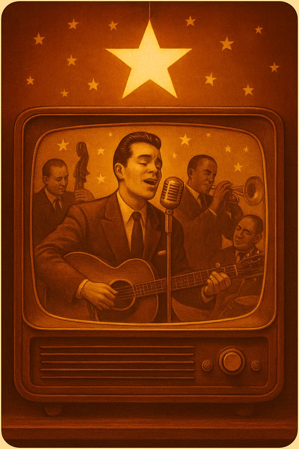 sad vintage crooner style, 1940s-1950s vibe, slow mid-tempo waltz, black blues roots rock and roll, warm analog tape sound, upright bass, brushed drums, jazz guitar, piano swing, deep raspy low blues male vocal, slight slapback echo, gospel backing vocals, emotional and nostalgic mood, live room reverb, RCA44 vintage microphone tone, smooth sax solo, soft trumpet, smoky atmosphere, intimate club vibe#Hook image: 1950' bar ambiance_ yellow stars shape_realistic style detail
