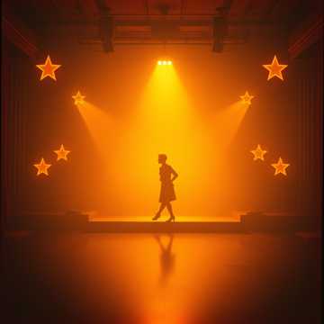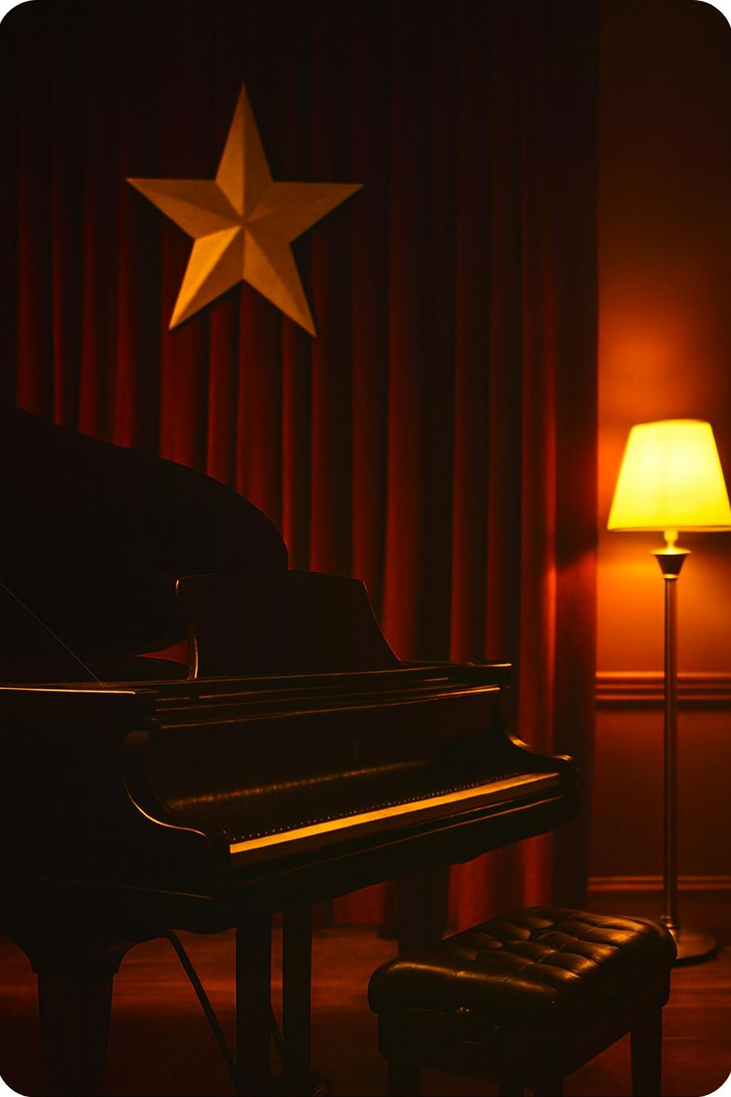 #Mood: peaceful, mystical and quiet intensity and ambient warm room, #solo:distant shred guitar gypsy and catchy brass section upbeat #hook image: 1950's dance club _with yellow stars _ realistic style