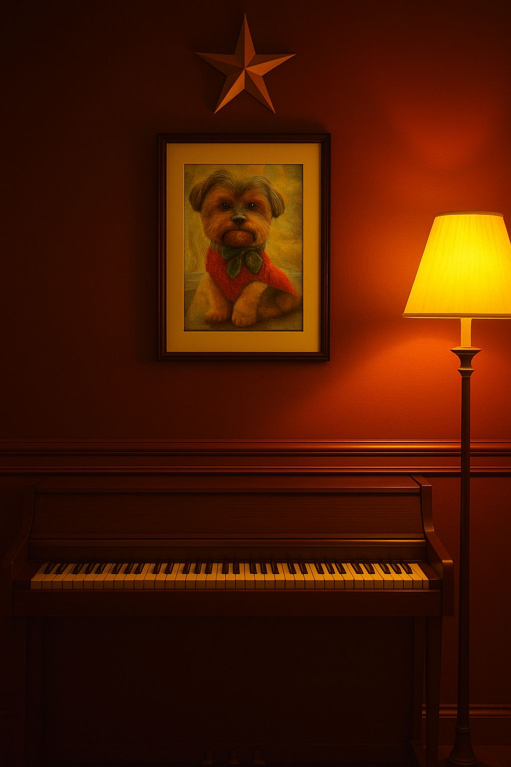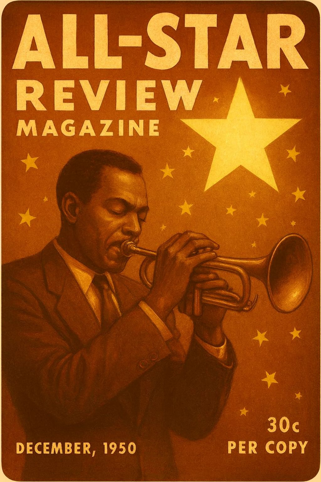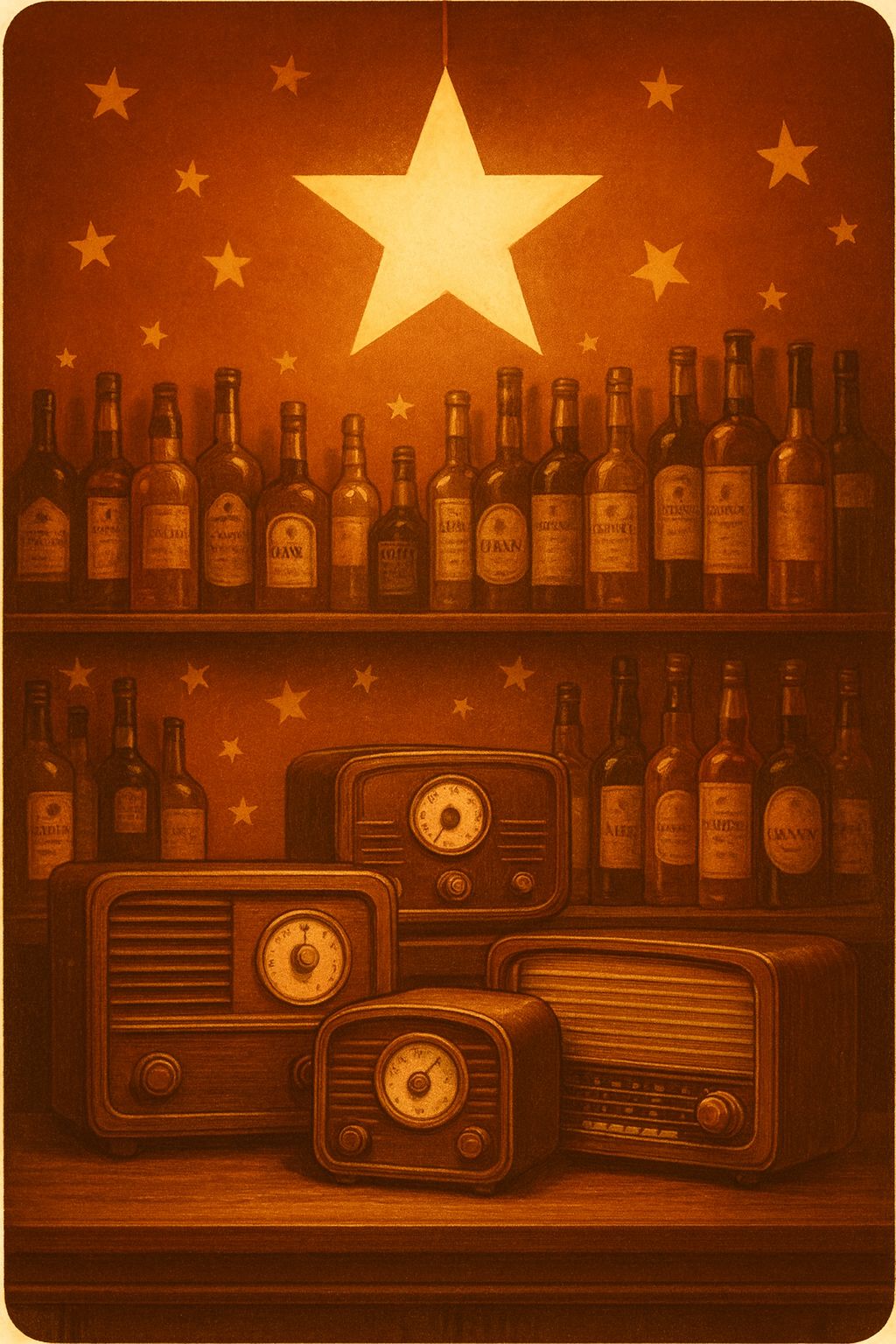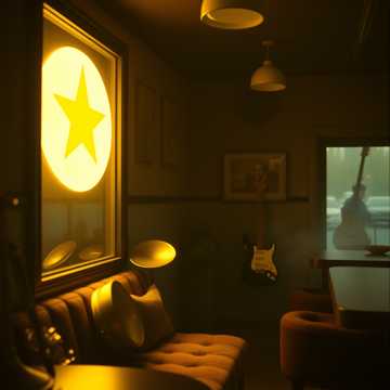 #Mood: peaceful, mystical and quiet intensity and ambient warm room, #solo:distant shred guitar gypsy and catchy brass section upbeat #hook image: old 1950 pub_with yellow stars_ realistic style
