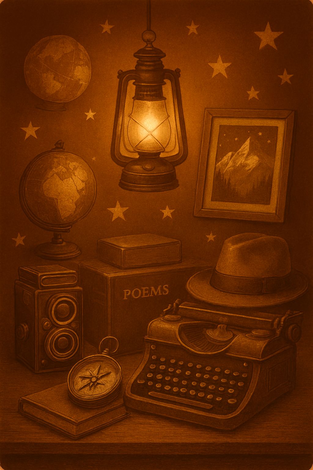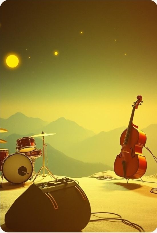 #Mood: peaceful, mystical and quiet intensity and ambient warm room, #solo:distant shred guitar gypsy and catchy brass section upbeat #hook image: vintage instruments 1950's on the top of a montain_with yellow stars _ realistic style