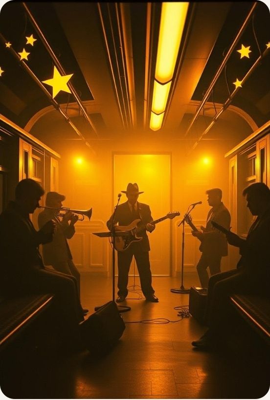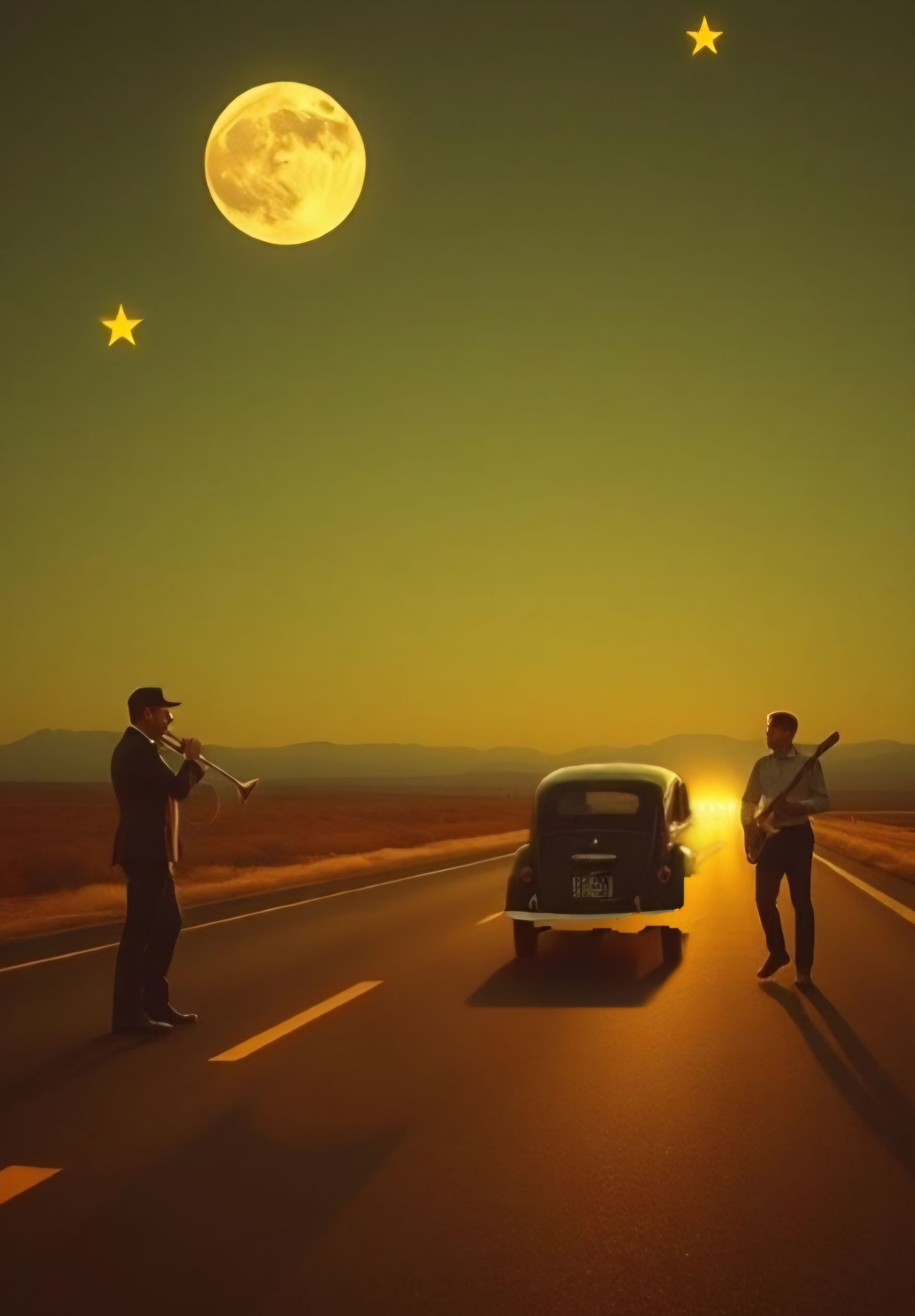 #Mood: peaceful, mystical and quiet intensity and ambient warm room, #solo:distant shred guitar gypsy and catchy brass section upbeat #hook image: 1950's band on the highway_with yellow stars shape _ realistic style