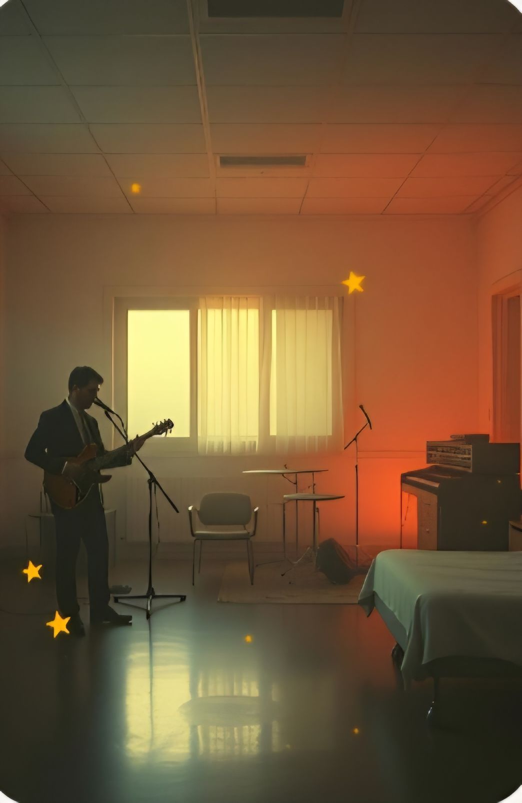 #Mood: peaceful, mystical and quiet intensity and ambient warm room, #solo:distant shred guitar gypsy and catchy brass section upbeat #hook image: crooners band in a psychiatric hospital_with yellow stars _ realistic style