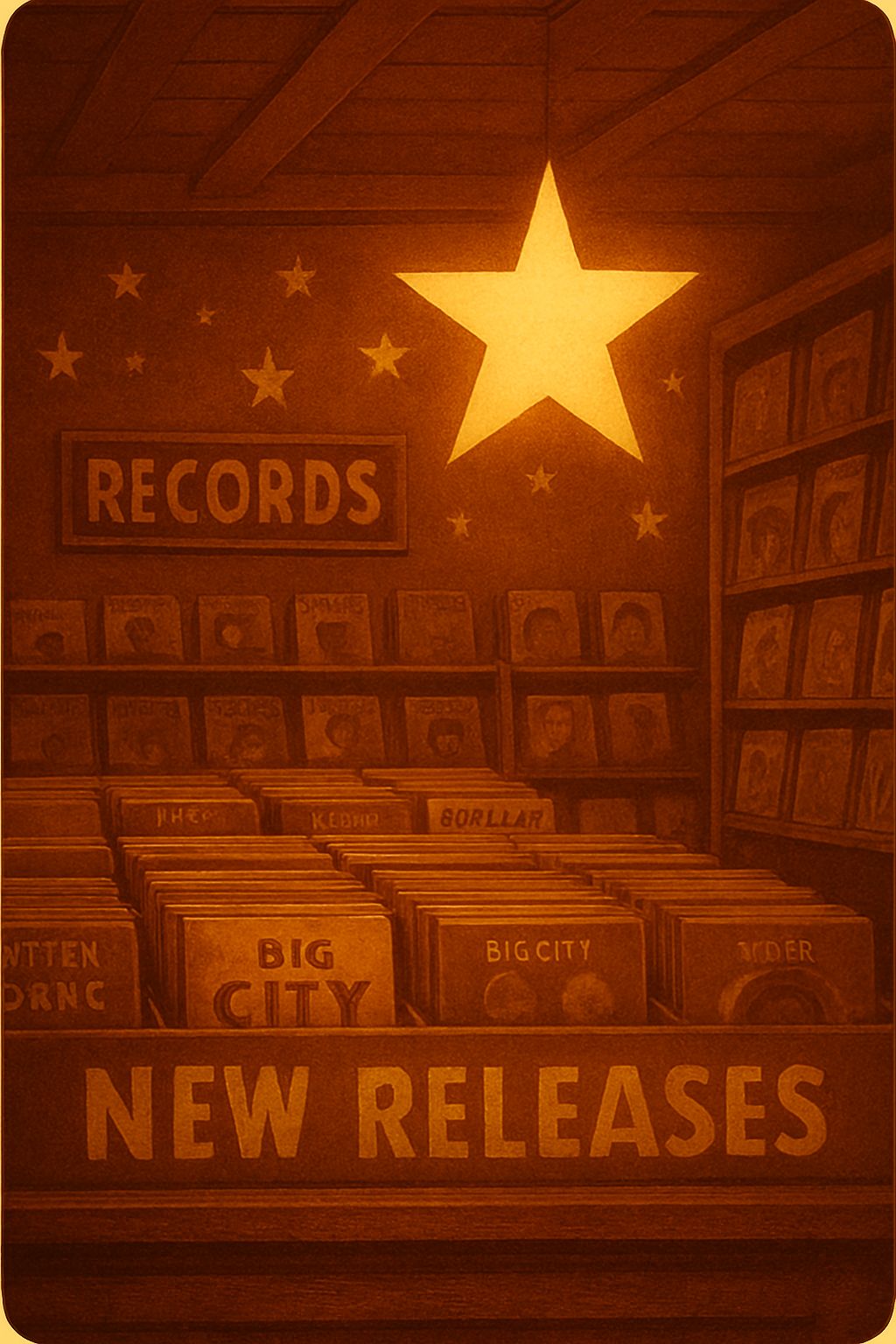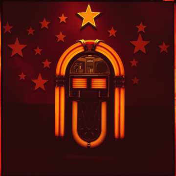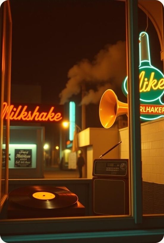 #Mood: peaceful, mystical and quiet intensity and ambient warm room, #solo:distant shred guitar gypsy and catchy brass section upbeat #hook image: 1950's milk shake shop _with yellow stars _ realistic style