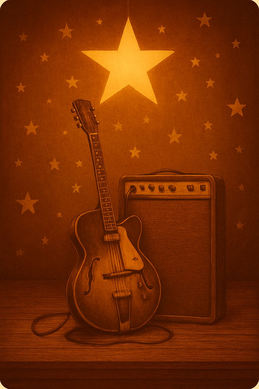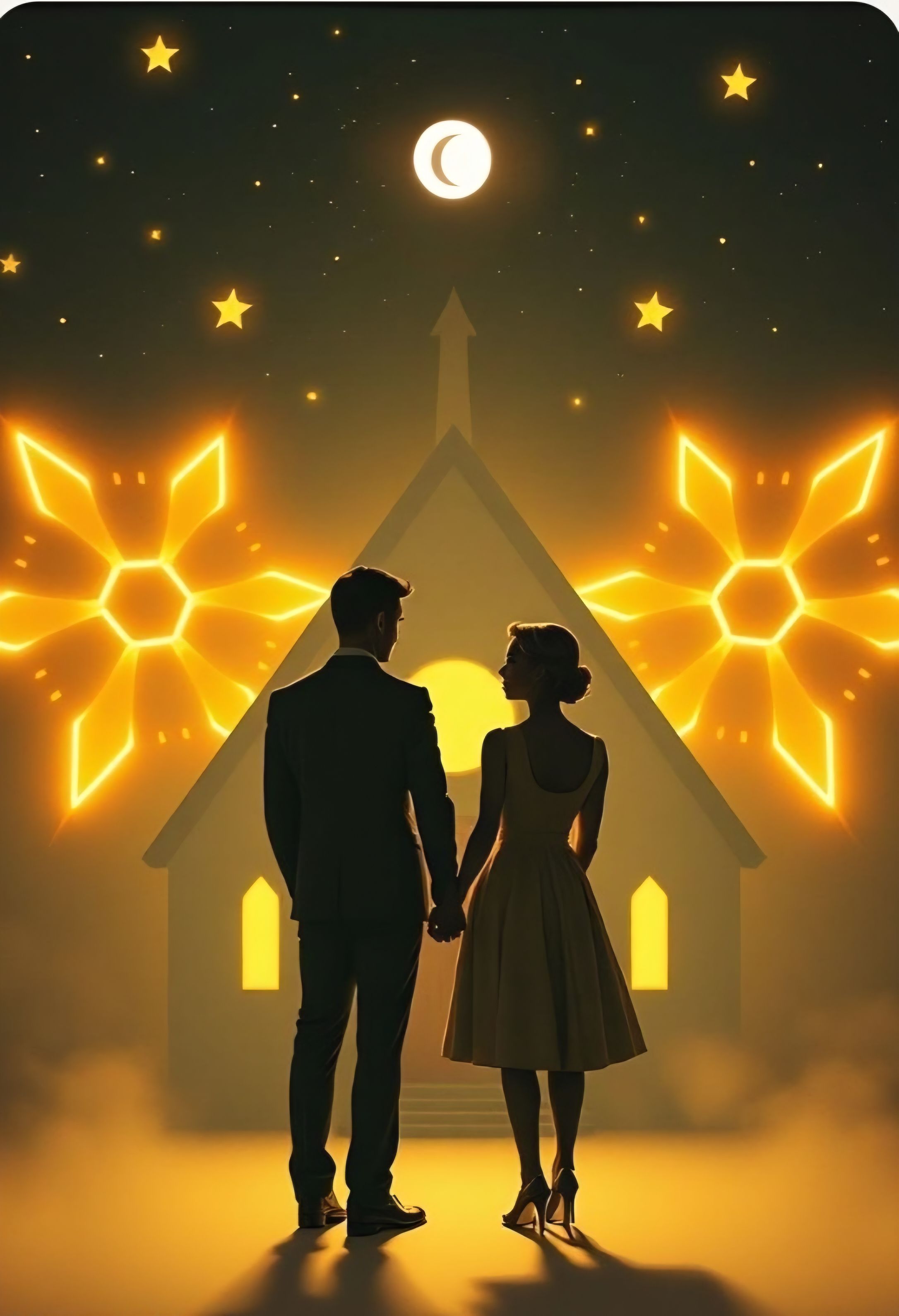 #Mood: peaceful, mystical and quiet intensity and ambient warm room, #solo:distant shred guitar gypsy and catchy brass section upbeat #hook image: 1950's scene of 2 lovers in front of a church under the stars_with yellow stars shape _ realistic style