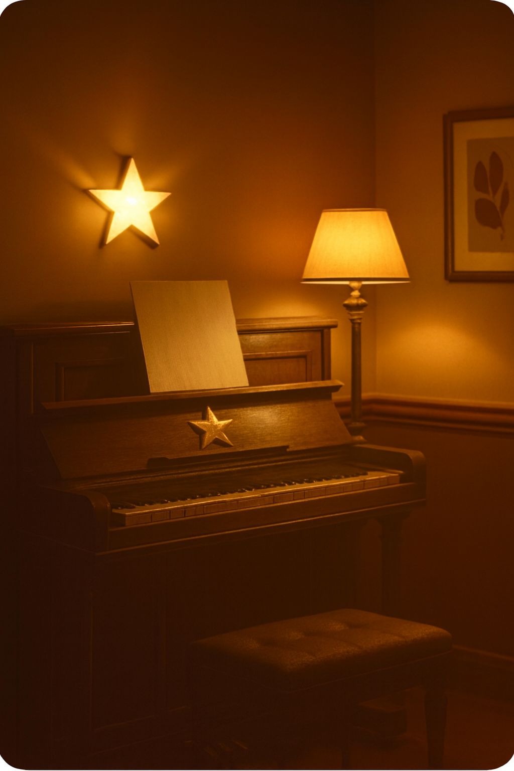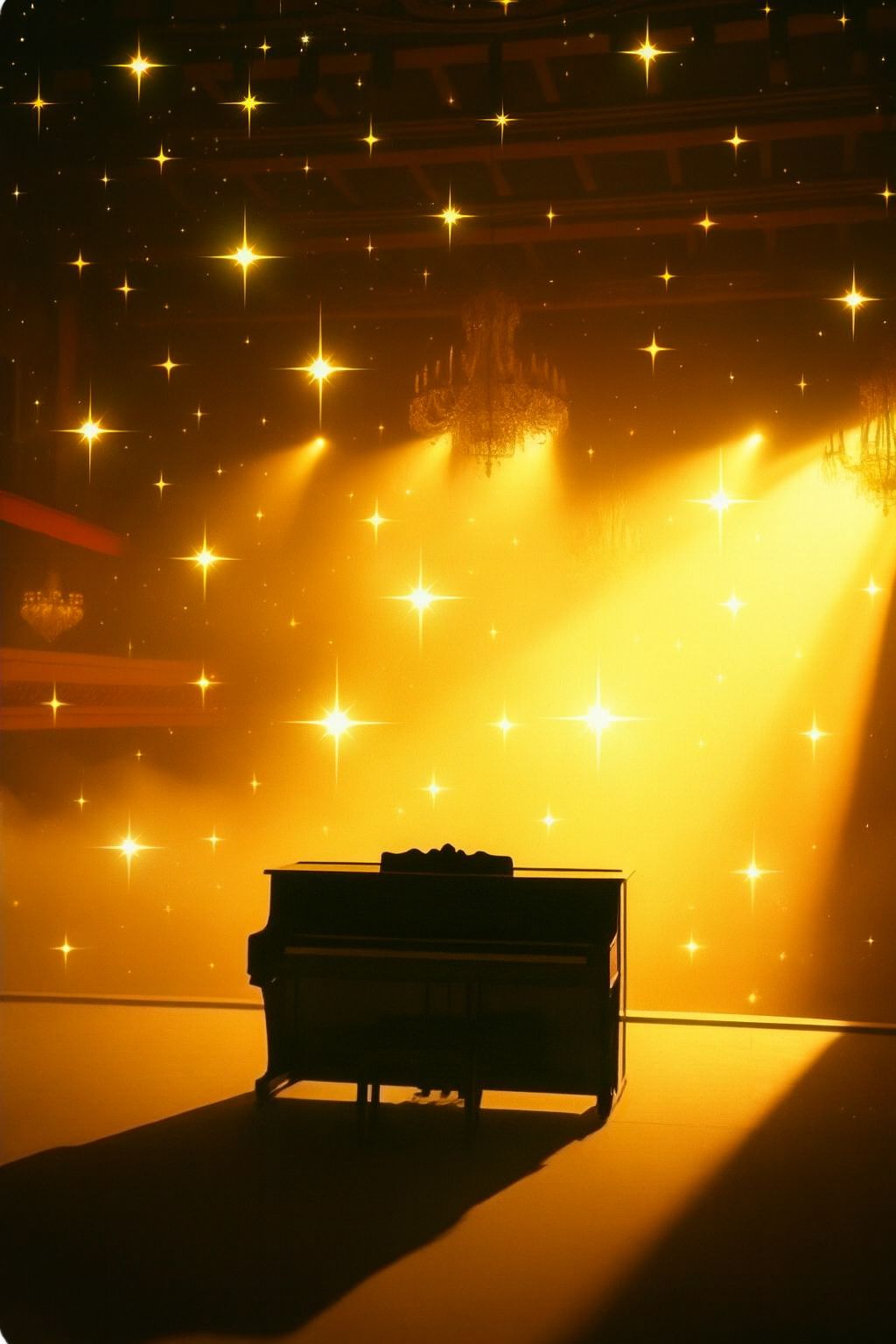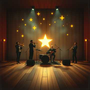 #Mood: peaceful, mystical and quiet intensity and ambient warm room, #solo:distant shred guitar gypsy and catchy brass section upbeat #hook image: crooners band at a weeding_with yellow stars _ realistic style