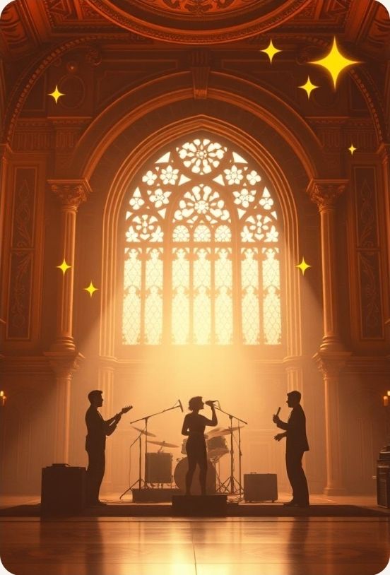 #Mood: peaceful, mystical and quiet intensity and ambient warm room, #solo:distant shred guitar gypsy and catchy brass section upbeat #hook image: 1950' band in front of a church in a field of gold_with yellow stars shape _ realistic style