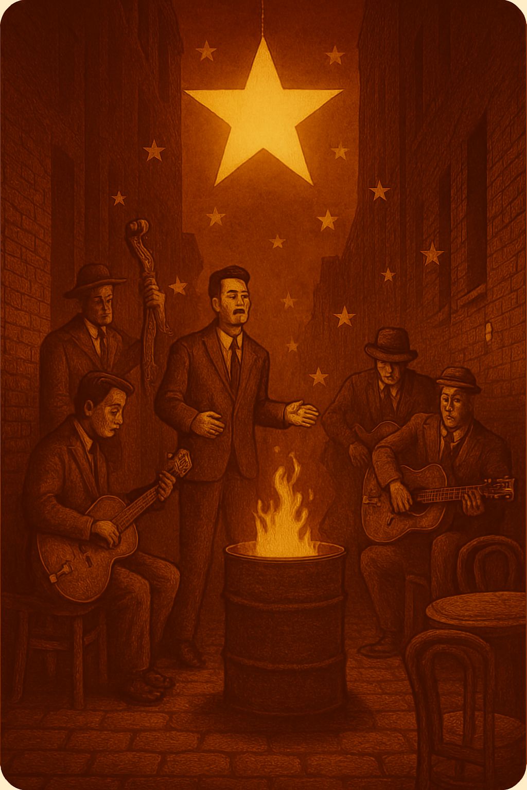 #Mood: peaceful, mystical and quiet intensity and ambient warm room, #solo:distant shred guitar gypsy and catchy brass section upbeat #hook image: 1950 musiciens in the subway in New York_with yellow stars _ realistic style