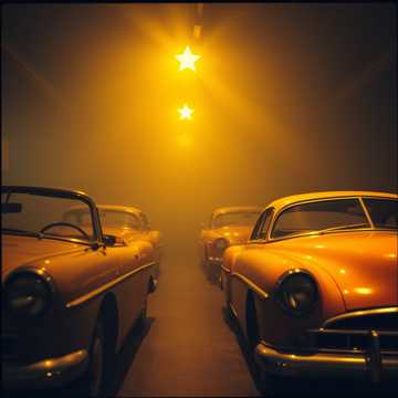 #Mood: peaceful, mystical and quiet intensity and ambient warm room, #solo:distant shred guitar gypsy and catchy brass section upbeat #hook image: vintage crooners in a middle of a old cars collection_with yellow stars _ realistic style