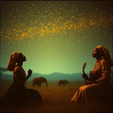 #Mood: peaceful, mystical and quiet intensity and ambient warm room, #solo:distant shred guitar gypsy and catchy brass section upbeat #hook image: african women singin in the savane _with yellow stars _ realistic style_epic detail