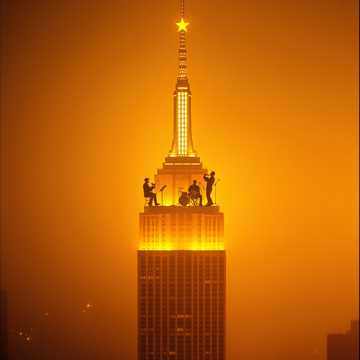 #Mood: peaceful, mystical and quiet intensity and ambient warm room, #solo:distant shred guitar gypsy and catchy brass section upbeat #hook image: crooners band in the top of the Empire State Building _with yellow stars _ realistic style
