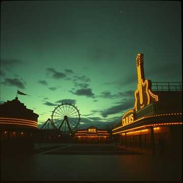 #Mood: peaceful, mystical and quiet intensity and ambient warm room, #solo:distant shred guitar gypsy and catchy brass section upbeat #hook image: 1950's rollercaster parck_with yellow stars _ realistic style