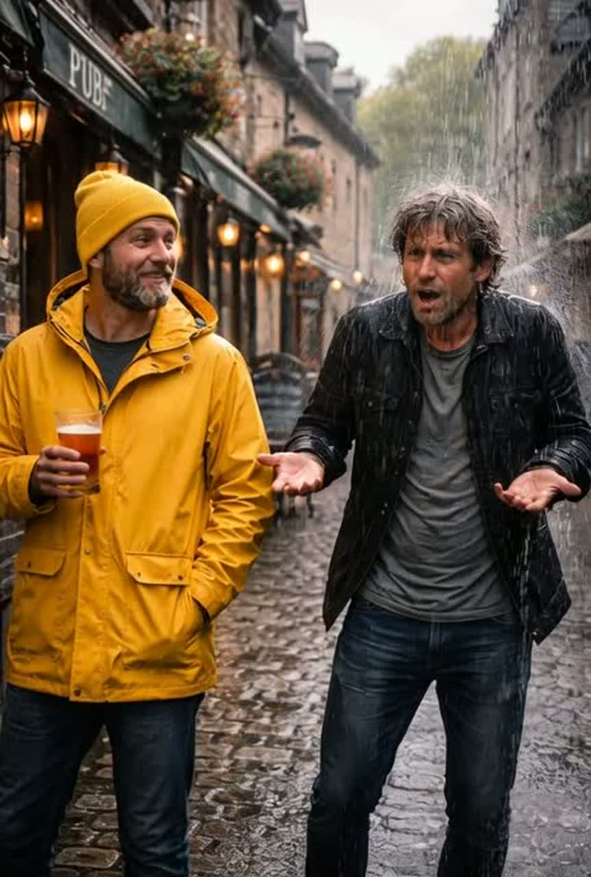 Folk-rock / Celtic rock song, Medium-fast tempo, raw live band energy, Dry, slightly nasal male lead vocal, natural Breton accent, spoken-sung and ironic, Acoustic guitar as main driver, punchy bass, simple steady drums, light electric guitar, subtle fiddle touches, Lyrics in French with humorous narrative dynamics about rain clichés in Brittany: tourists complain, locals smile, Verses are observational and calm, pre-chorus builds irony, chorus is catchy and pub-like, Recurring punchline, spoken or half-sung with confidence and humor: “Ici, il ne pleut que sur les cons !”