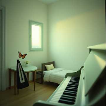 minimalist solo piano almost human but not quite, Disklavier-precision notes with subtle mechanical click beneath, butterfly-fragile melody evocative of Erik Satie, tremulous saxophone phrases curling through choral harmonies, eastern devotional warmth gradually building from calm to radiant, spiritual jazz with gentle spoken-word undertow, serene and slightly unsettling simultaneously, soft choral voices weaving in and out like bells, intimate and transparent, delicate repetitive patterns icing the listener, melancholic yet forward-leaning with soft power, slow meditative tempo, quiet courage in the sound