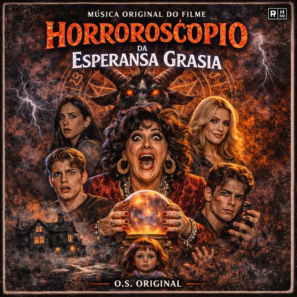 italian theatrical pop, broadway finale, ensemble cast vocals, mixed-gender harmonies, half-spoken croon, full-throated belt, electric violin riffs, brass stabs, stomping percussion, snare rolls, dance break, sound effects, key-change lift, plate reverb, sidechain compression, glittering button chord, comic horror, anthemic, 128 BPM