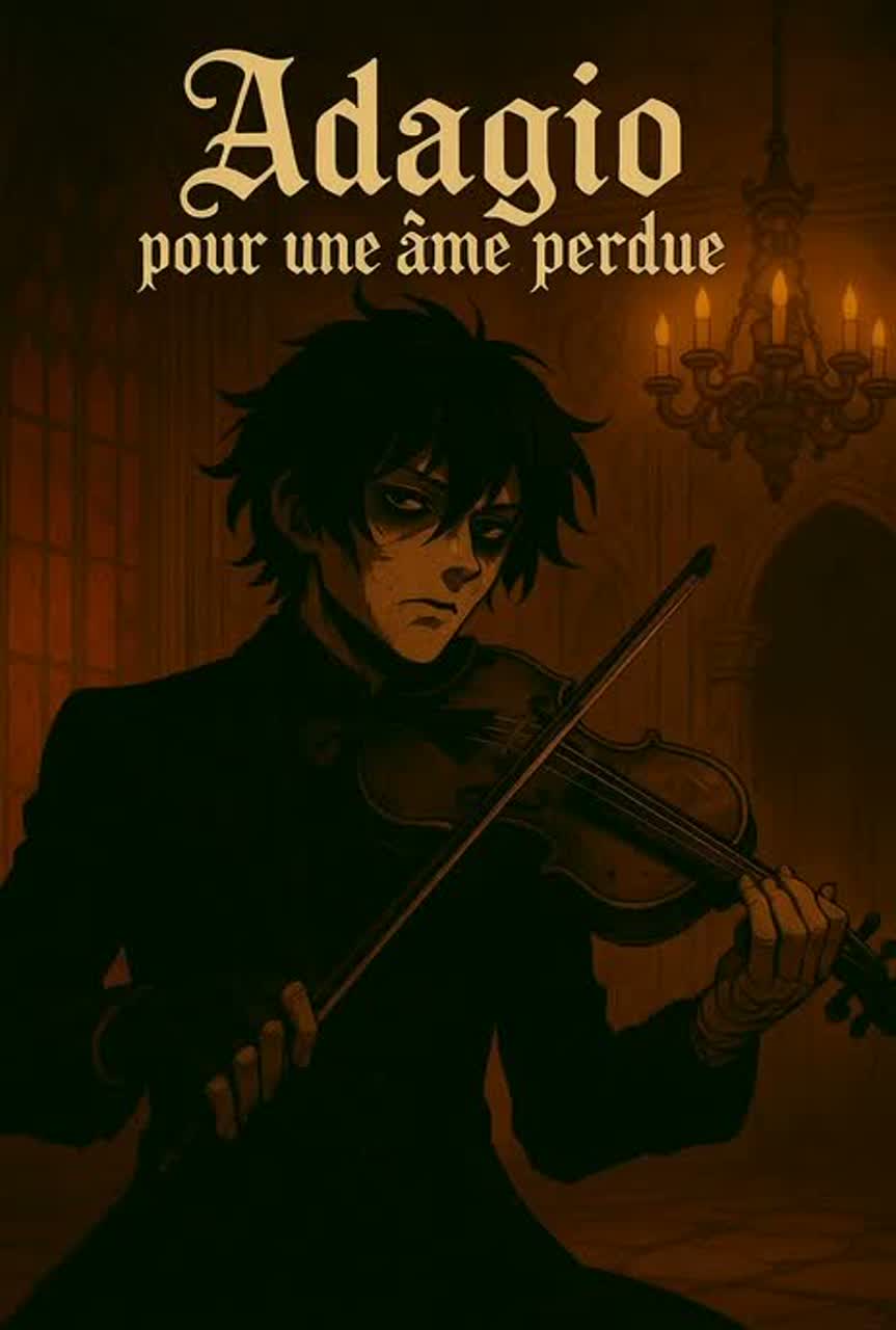Cinematic, morbid, heart aching, Dark symphonic metal ร adagio nocturne ร neoclassical goth rock with a single electric violin as both melody and distortion layer, Slow 54 BPM in D minor, Male baritone lead voice โ clear diction like Lea Salonga, theatrical and expressive, every word intelligible, Blend of French and English lyrics with soft French accent, Vocal delivery raw, emotional, heavy but elegant; operatic phrasing, sustained vibrato, controlled breath, Verses intimate and melancholic โ chorus swells into metal power and gothic drama โ returns to fragile whispers, Dynamic layering: violin harmonics, tremolo arcs, metallic feedback bursts, orchestral pads behind, Mood tragic, haunting, cinematic โ a genius confessing his curse through music, Emphasize clarity, emotion and contrast between soft adagio sections and explosive rock surges, End with a single fading violin note and a whispered โAdagioโฆ pour une รขme perdue, โ