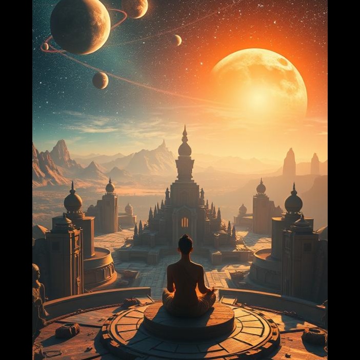 Cosmic ambient electronic, deep meditative soundscapes, vintage analog synthesizers, long-form compositions, spacey drones, ethereal pads, minimalist sequencer patterns, Moog synthesizer, contemplative electronic, space ambient, Berlin school electronic, hypnotic textures, floating melodies, cosmic meditation, atmospheric layers, vintage drum machines, progressive electronic evolution, psychedelic ambient, spiritual electronic journey