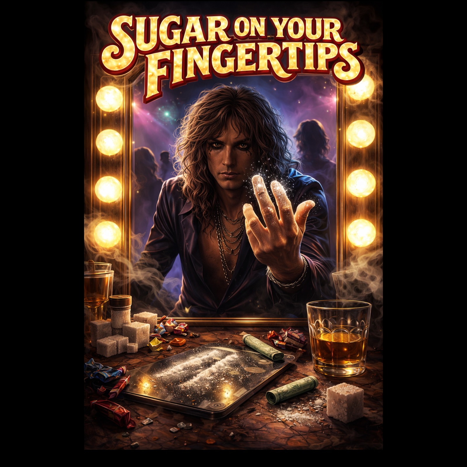 1970s glam / hard rock with psychedelic undertones, Mif-tempo, hypnotic build into swaggering, riff-driven verses and explosive arena-style choruses, Thick fuzz electric guitars with crunchy power chords and bluesy bends, groovy bass, punchy vintage drum kit with heavy toms and ride cymbal, Swirling Hammond organ and subtle analog synth textures add a trippy, narcotic atmosphere, Tempo moderate with gradual tension builds leading to dramatic dynamic shifts, Long expressive guitar solo with wah and feedback, Mood dark, seductive, dangerous, and raw — a sugar-fueled rise and crash, Vocals gritty and theatrical with glam swagger: slightly raspy lead, confident and hypnotic in verses, soaring and dramatic in choruses, with occasional layered gang-style backing vocals, Production should feel analog, warm, slightly dirty, and vintage, like a smoky 70s rock club performance