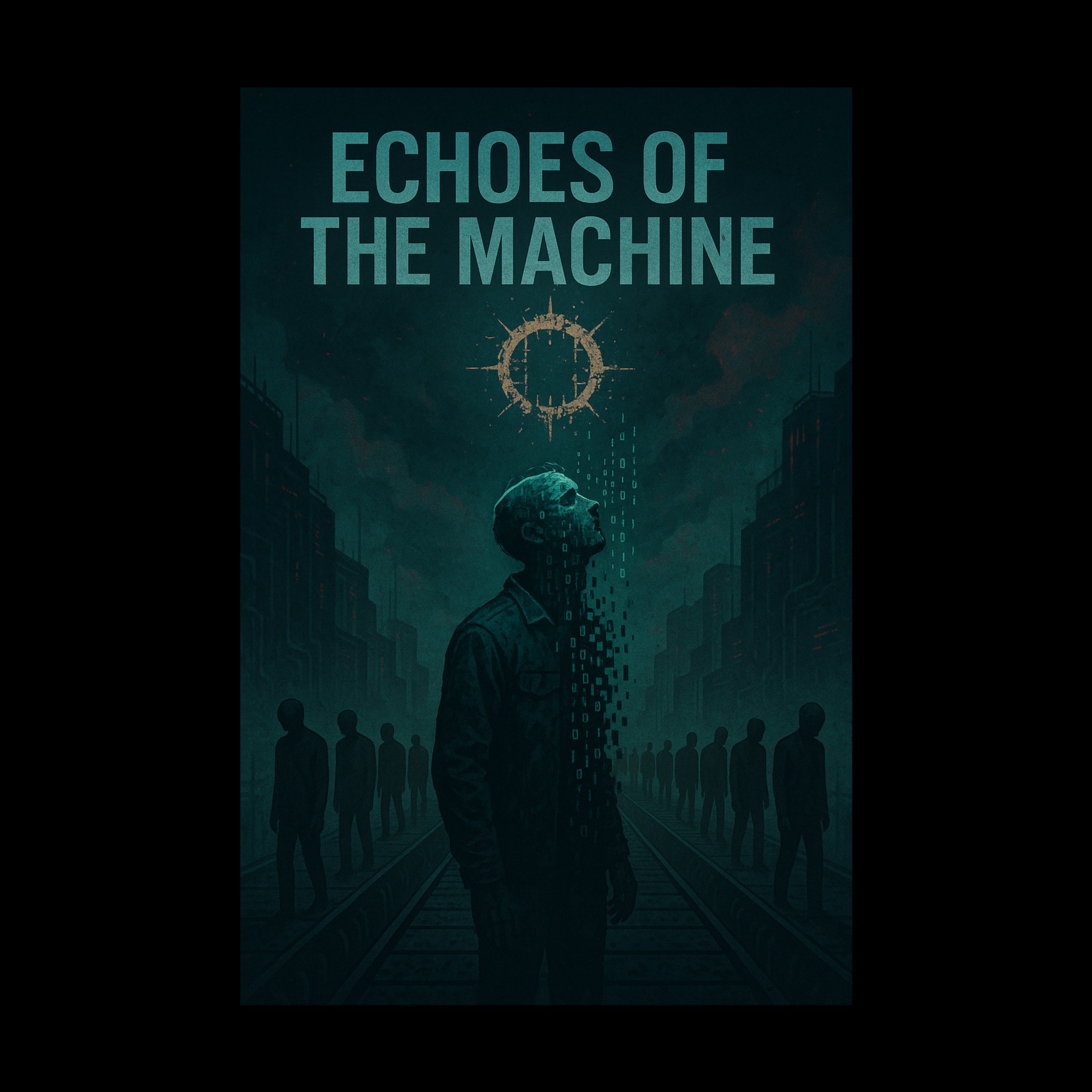 A dystopian soundscape with mechanical beats, heavy distorted guitars, deep synth layers, and a haunting male voice, Starts slow and cold, builds tension, ends in ambient static, The lyrics speak of a world where humans are just echoes of machines