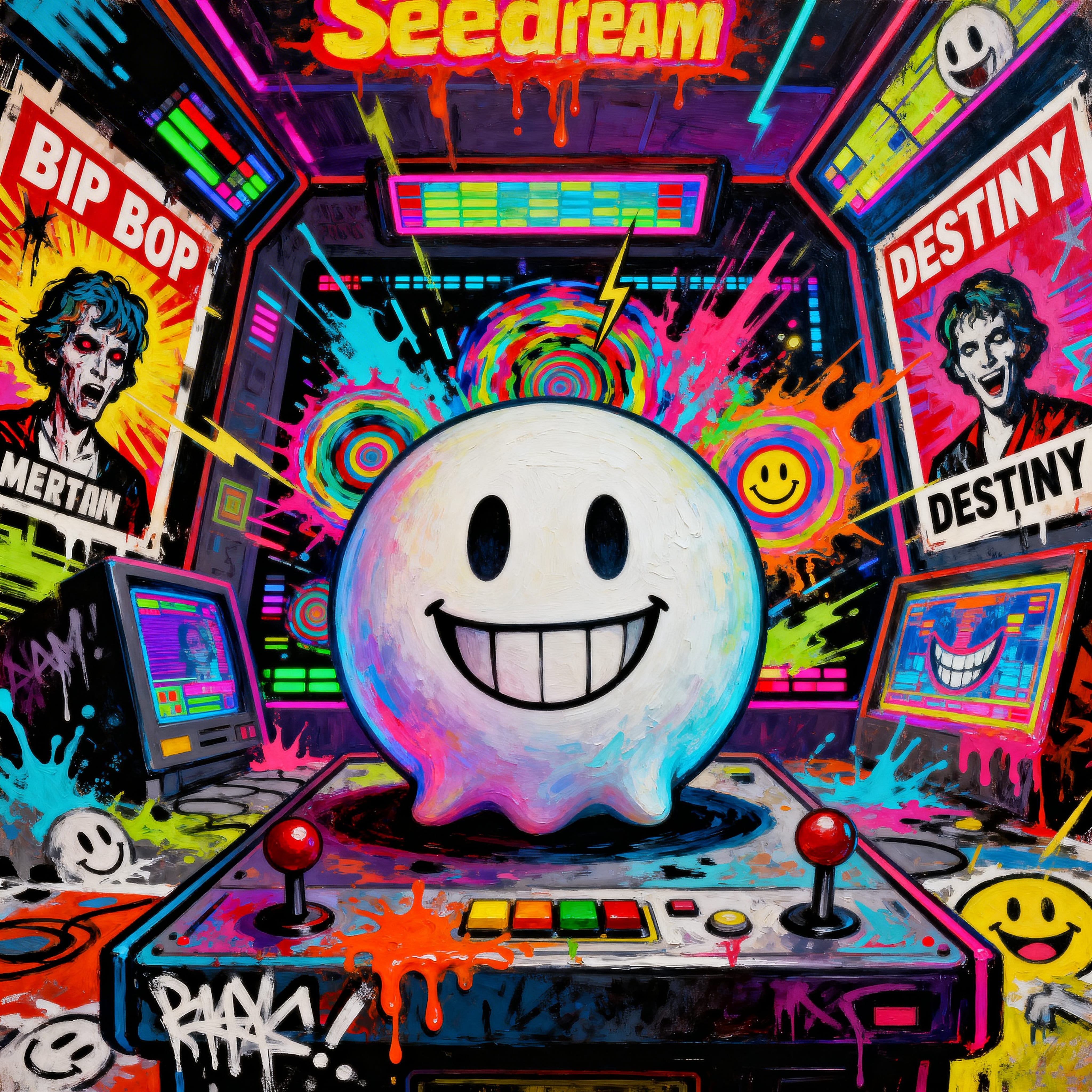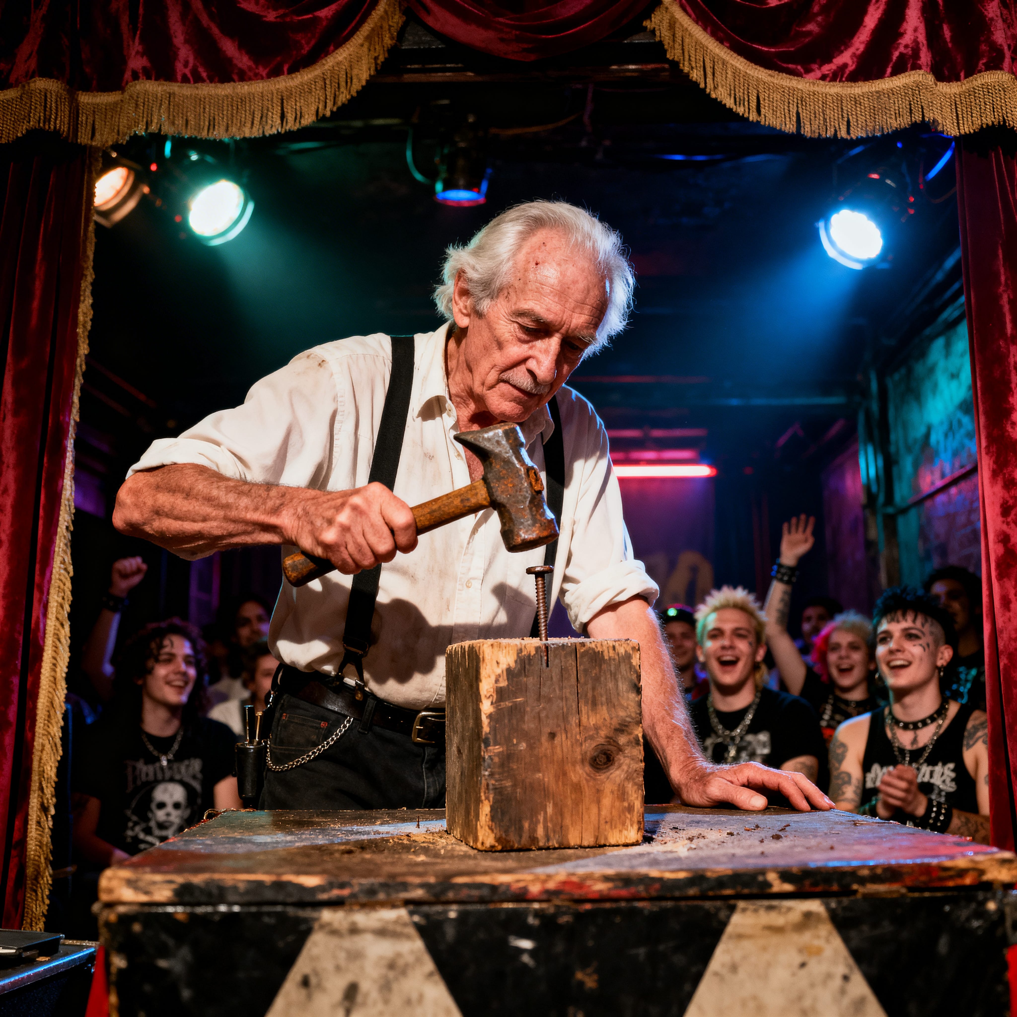 Comedic black metal punk hybrid with fast blast beats, raw tremolo guitars, and bouncy punk rhythms, Harsh shrieked vocals mixed with cartoonish demonic spoken-word and crowd chants, Satirical, self-aware tone blending occult black metal imagery with absurd humor and stage theatrics, Catchy chorus, call-and-response sections, chaotic breakdowns, and a rave-like finale, Lo-fi, underground production that feels intentionally unhinged but energetic and fun, Themes of evil parody, ritual gone wrong, and playful blasphemy