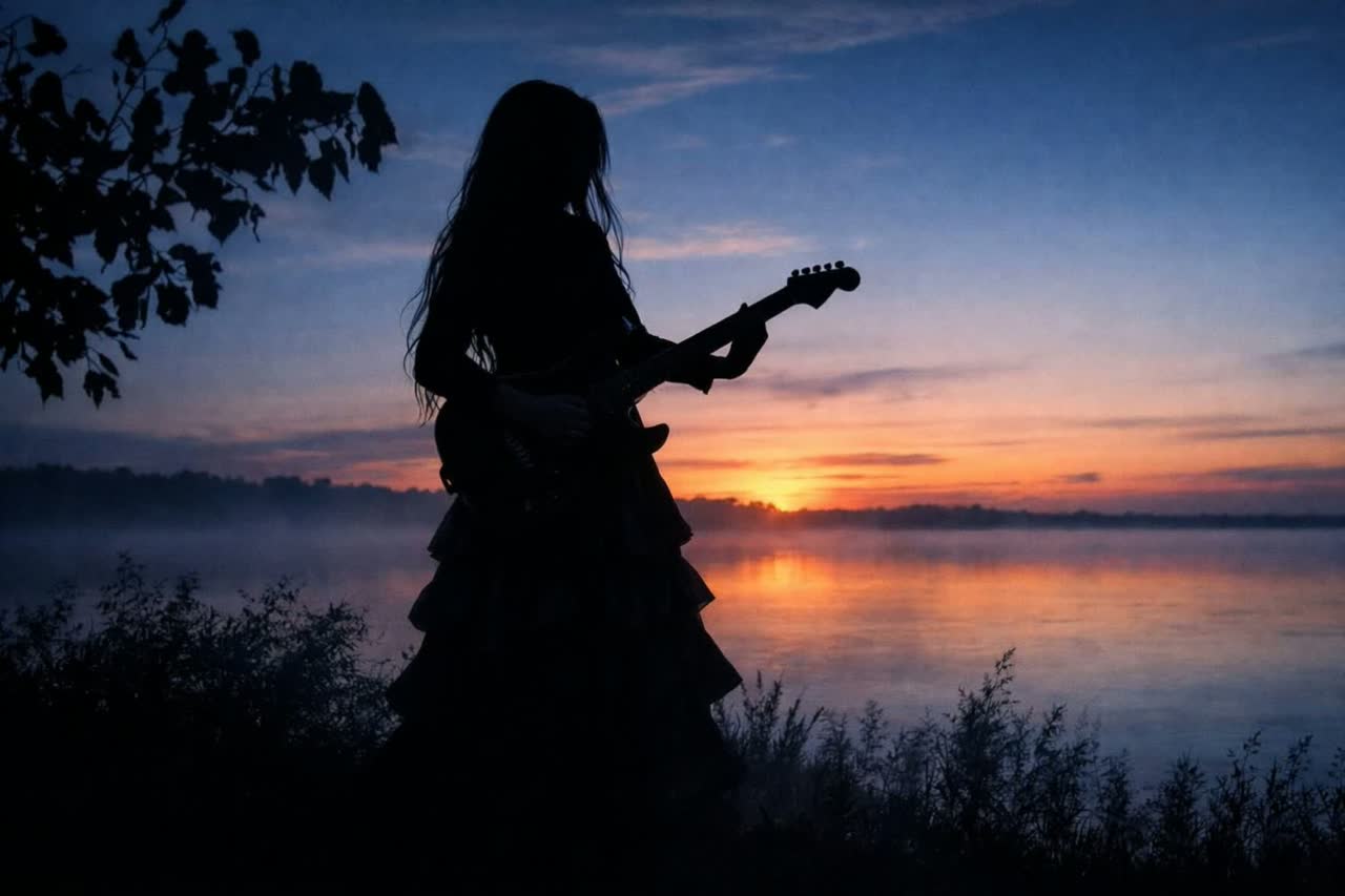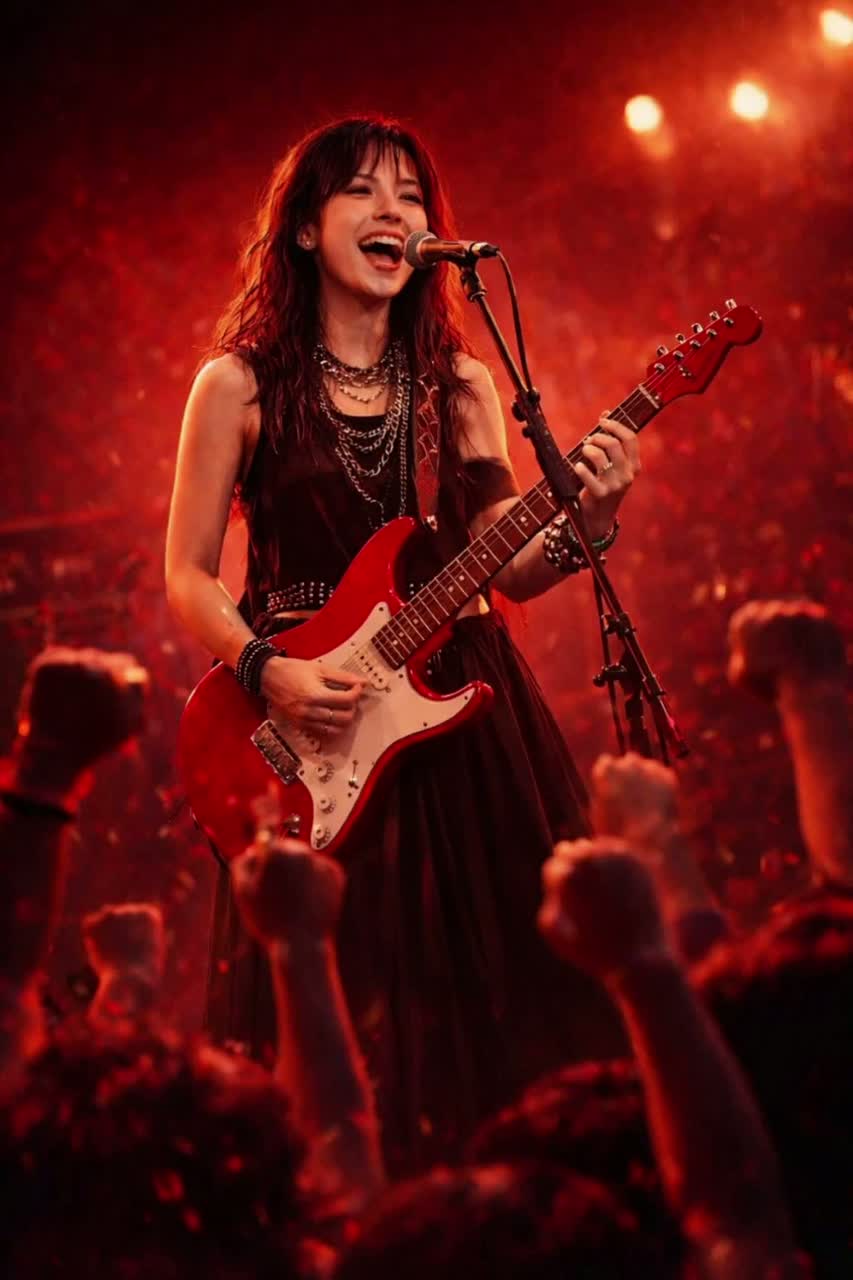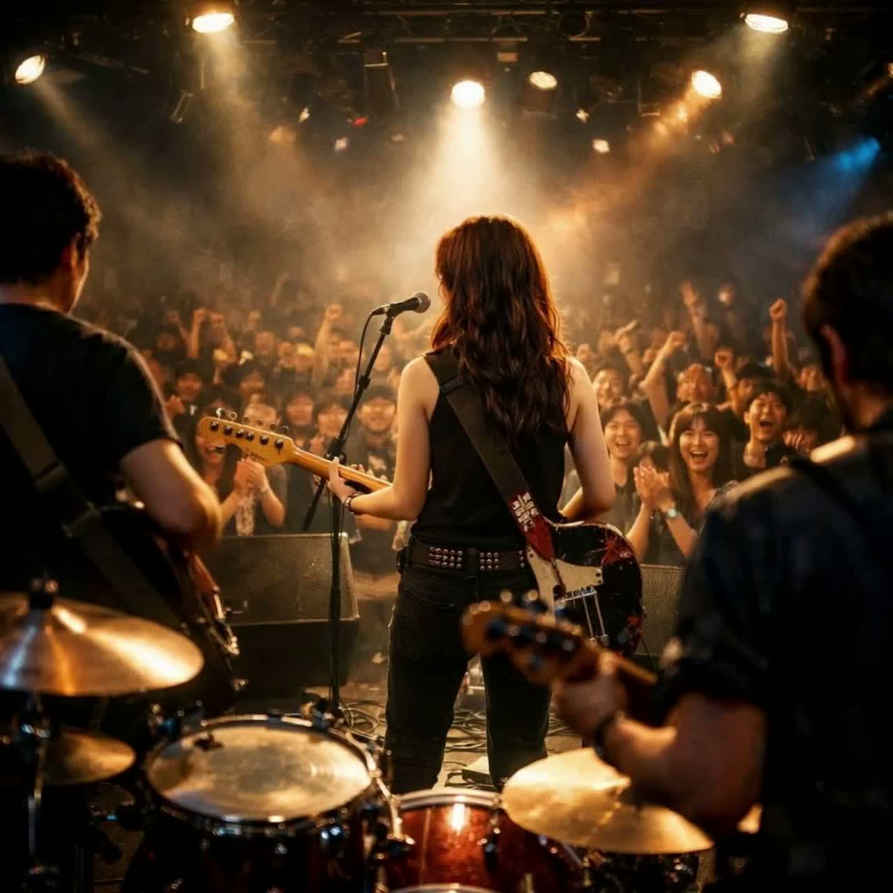 Female vocal emotional punk rock song, Tempo around 170 BPM, Fast, driving, and emotional punk rock with a strong sense of momentum, Sound is raw but melodic, not metal, not pop-punk — emotional punk with sincerity, Drums are fast and straightforward, aggressive 8th-note punk beat with strong snare hits, Bass is thick and driving, following root notes tightly to support speed and emotion, Electric guitar uses crunchy distortion with clear chord definition, Power chord strumming dominates verses and choruses, Palm-muted rhythm guitars in verses, fully open chords in chorus, Vocals are female, emotional and honest, Verses are restrained and slightly fragile, Pre-chorus builds tension with rising melody, Chorus opens up strongly, catchy and shoutable, designed for live sing-alongs, Japanese punk rock style vocal phrasing, Theme: loving guitar and music through pain, emptiness, anger, joy, and despair, Mood is passionate, uplifting, and cathartic