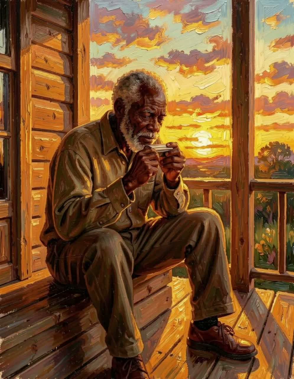 Blues, old male voice, piano, harmonica, symphony orchestra, lo-fi, mellow, emotional, downbeat, ambient ambience, echoing echoes