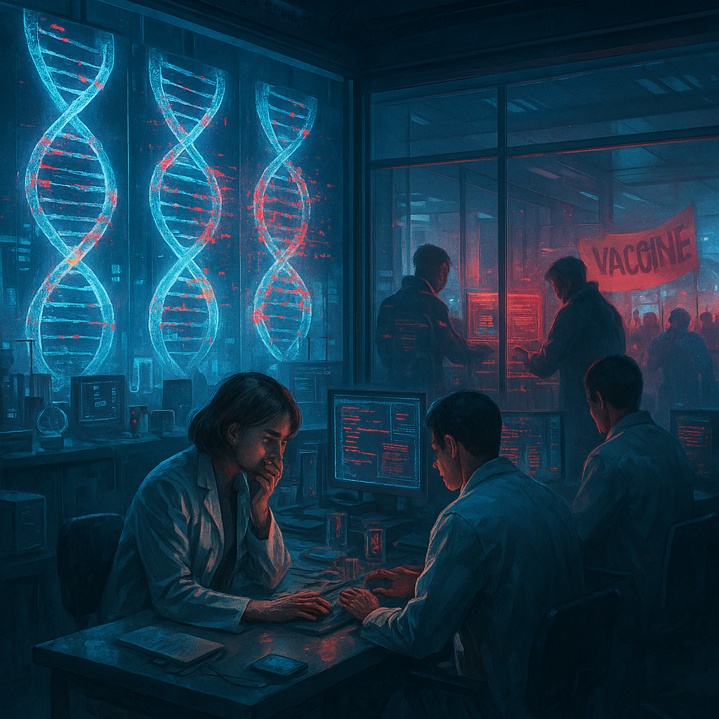 Dark cinematic synthpop with clinical, sterile textures, Pulsing basslines, icy pads, and sharp synth stabs, Vocoder-heavy chorus with tense, dramatic male vocals, Tone: cold, urgent, conspiratorial