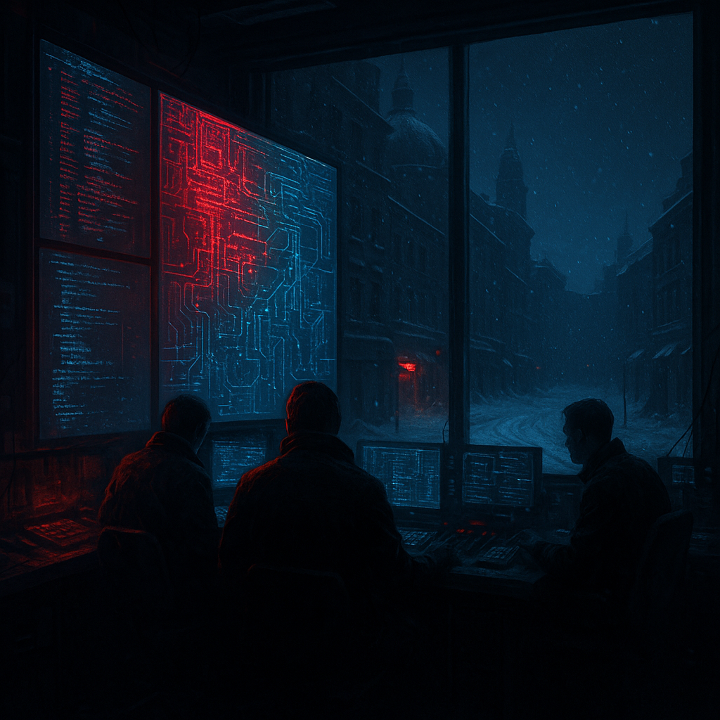 Dark 80s-inspired synthpop with cyber-thriller tension, Driving electronic basslines, icy arpeggios, cinematic pads, vocoder-heavy choruses, Suspenseful, urgent, global in scale, evoking espionage and digital warfare