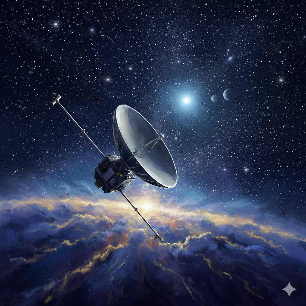 An epic and emotional journey through space, capturing a sense of both vast loneliness and unwavering determination, The track should feature a powerful, clear female vocal performance in Japanese, soaring over a backdrop of lush, evolving analog synthesizers, Use driving, rhythmic arpeggios and a strong beat for the energetic "swing-by" sections, contrasting with vast, beatless, and dark ambient soundscapes for the interstellar travel parts, The moment of breaking through the heliosphere should be a dramatic, explosive chorus with a full orchestral synth sound and a powerful kick drum, Incorporate subtle glitch noises and a distant, melancholic piano to represent fading memories and the probe's inner world, The overall mood should be introspective, melancholic, yet ultimately hopeful and awe-inspiring, Language: Japanese