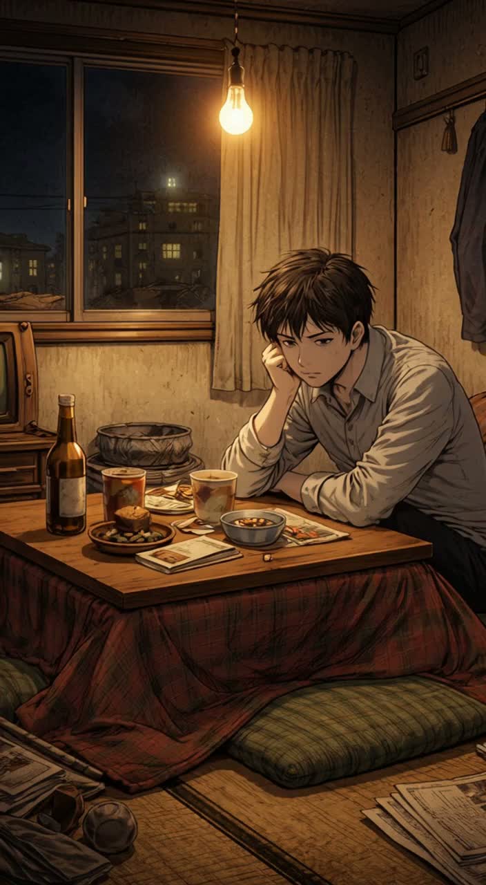 A dark, melancholic Japanese folk song inspired by 1970s Showa-era folk music, Slow to mid-tempo, minor key, with a quiet and nostalgic atmosphere, Male vocal, calm and slightly weary, emotionally restrained and intimate, Simple, honest singing with no dramatic expression, Minimal vintage arrangement: