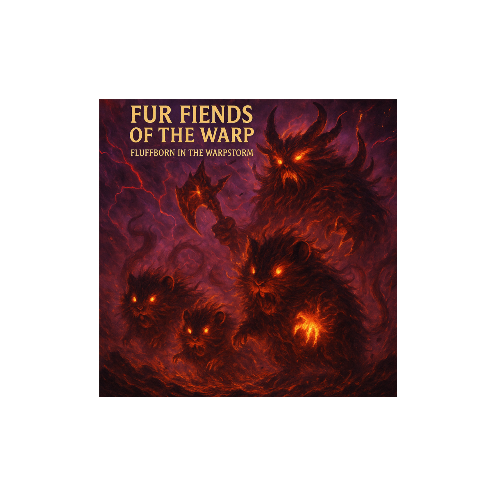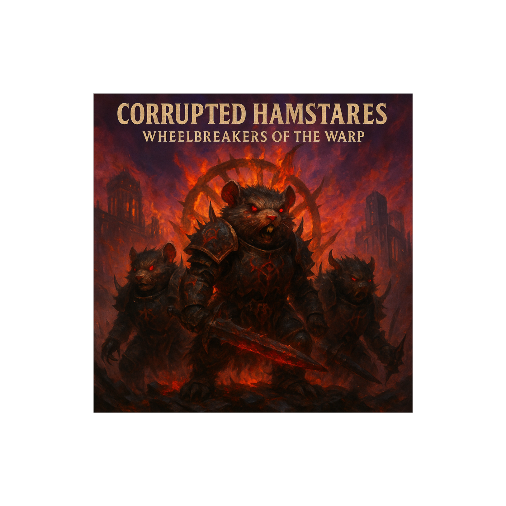 heavy orchestral metal, demonic choir, industrial percussion, screaming guitars, grimdark tone, Warhammer Chaos energy, hybrid cinematic metal