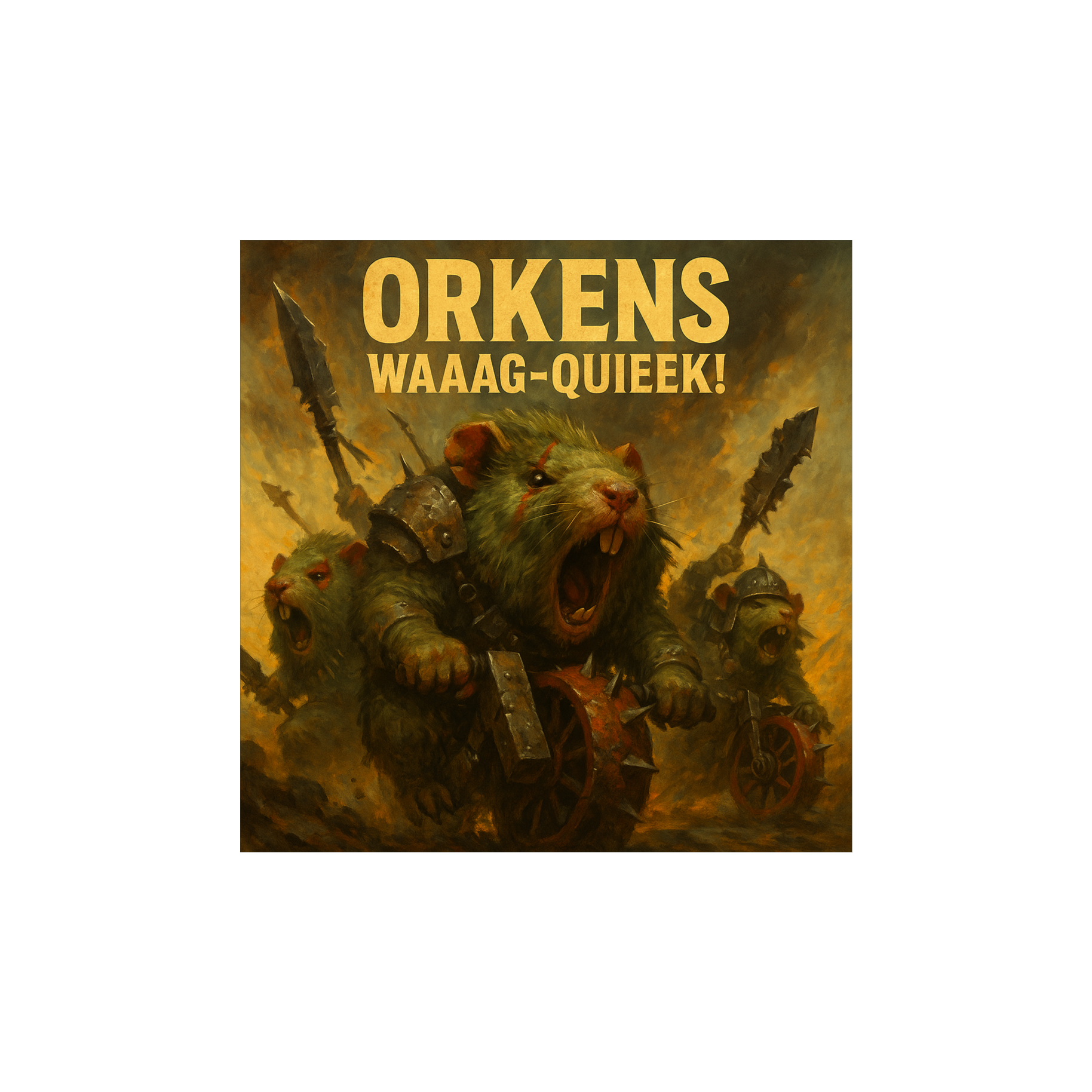 heavy metal, tribal drums, fast tempo, wild chanting, comedic aggression, anthem energy, WH40K ork vibes