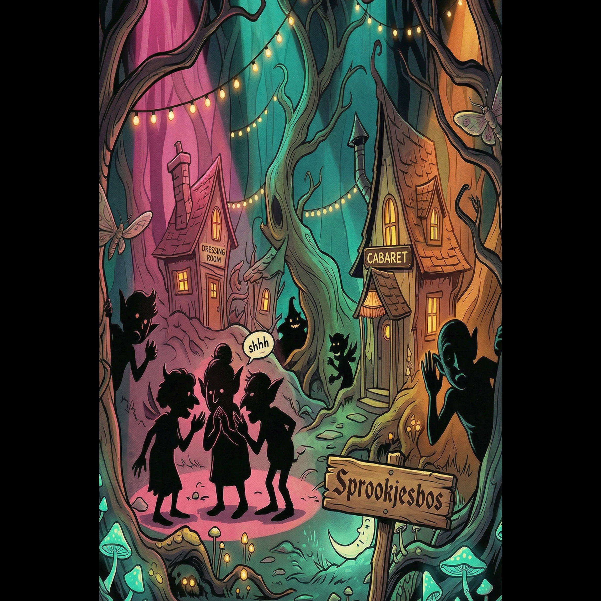 dark cabaret, Dutch chanson, barrel organ melody, music box celesta, theatrical accordion, bass drum thump, whispered baritone, spoken intro, sung verses, fast chorus, call and response, storybook menace, midnight forest, mischievous humor, worn mono tape, spring reverb, dynamic build-up, layered stage cues