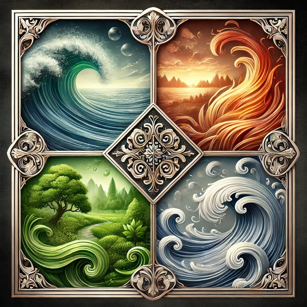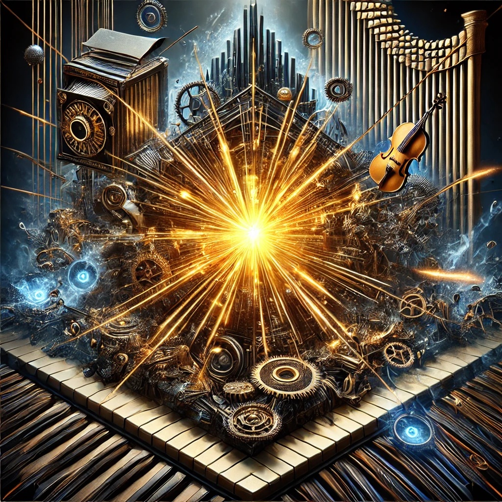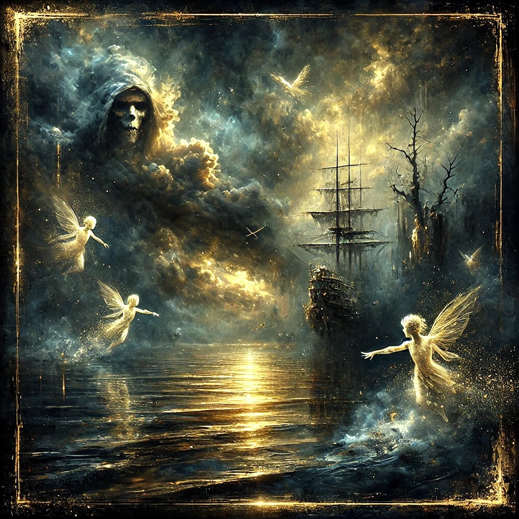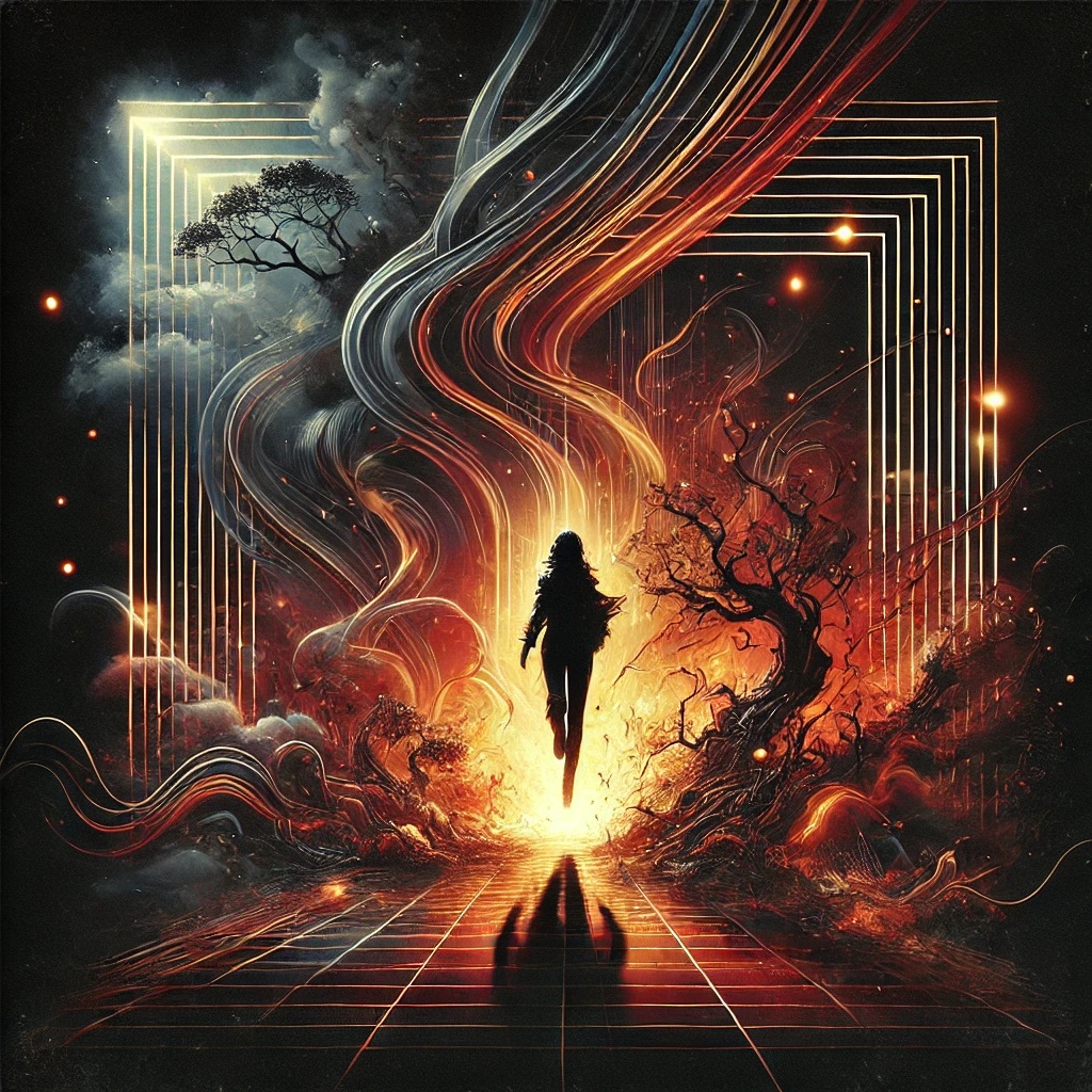 Distorted guitars, haunting strings, deep bass, chaotic drums, mystic synths, ethereal vocals, layered echoes, orchestral swells, dark drones, piercing drops, soaring violins, progressive riffs, brooding energy