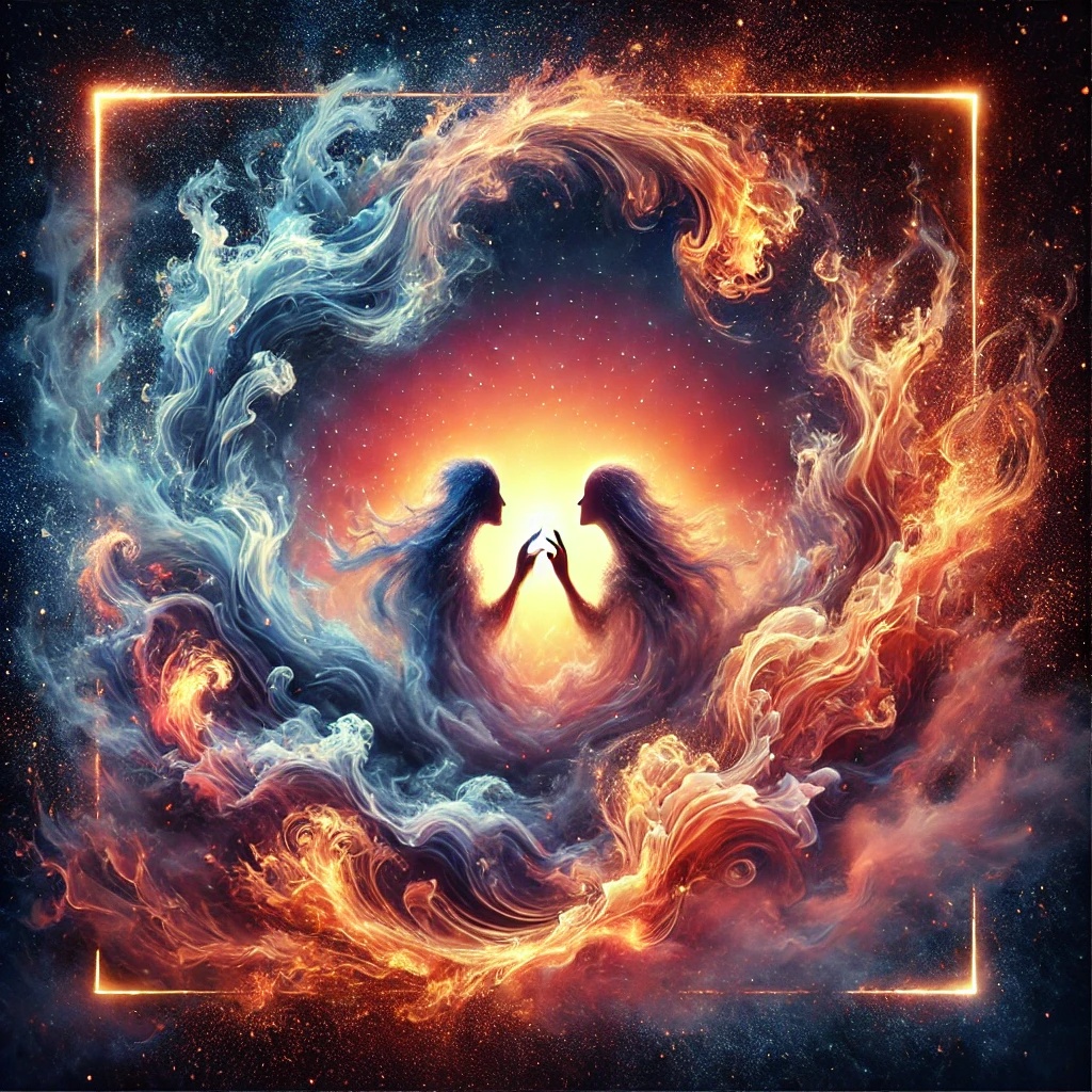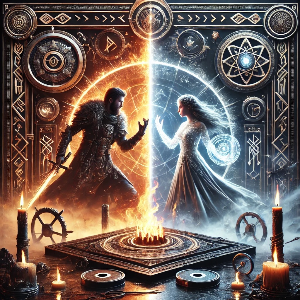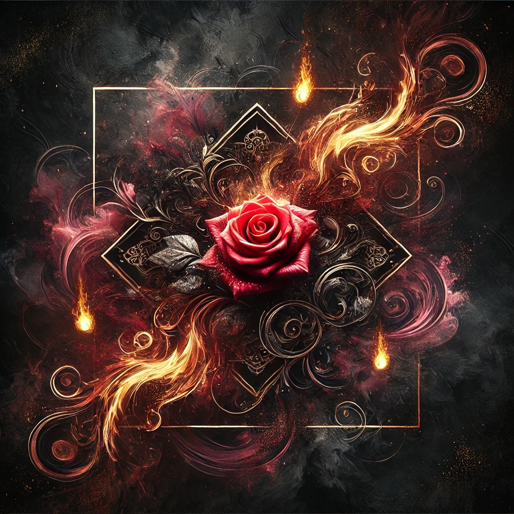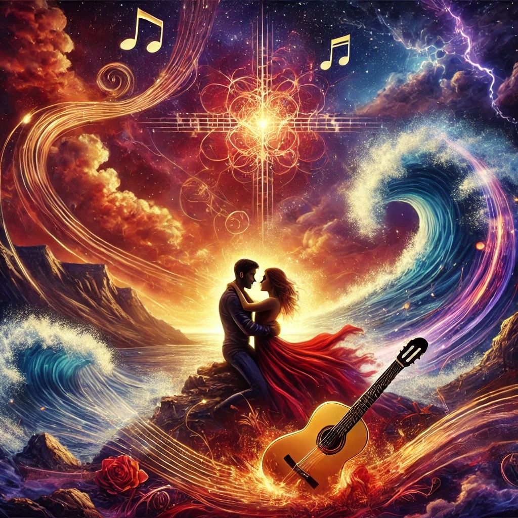 Heavy guitar riffs, powerful drums, deep basslines, epic solos, raspy male vocals, soaring female choruses, haunting whispers, intense drops layered harmonies, ethereal synths, fiery transitions, dark energy