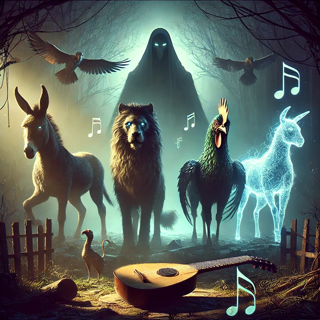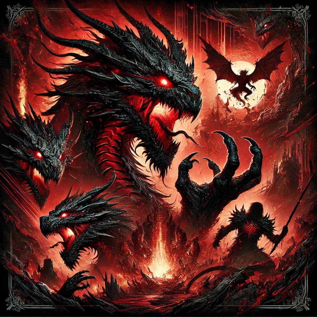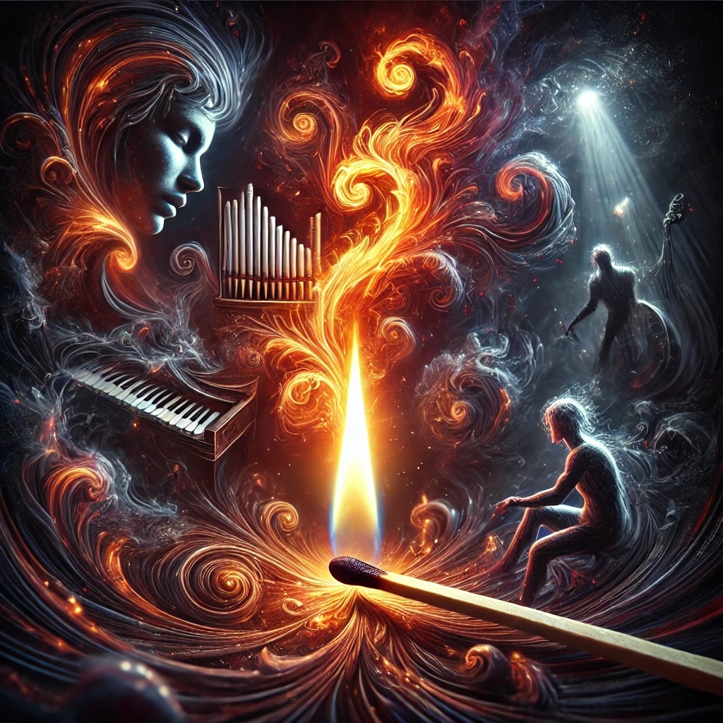 Dark drones, distorted guitars, haunting strings, orchestral swells, deep bass, chaotic drums, raspy vocals, piercing echoes, powerful chants, ethereal pads, fiery crescendos, mystic energy, intense harmonies