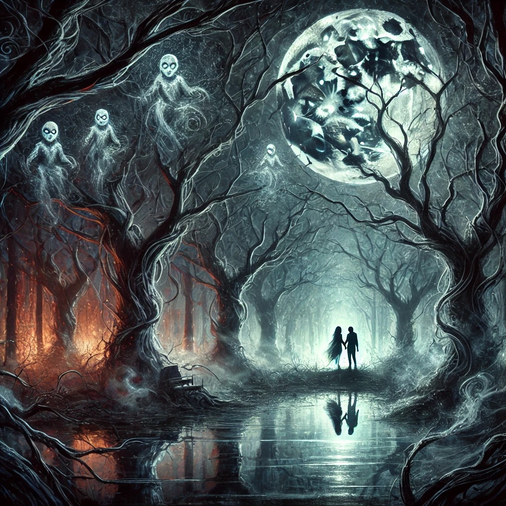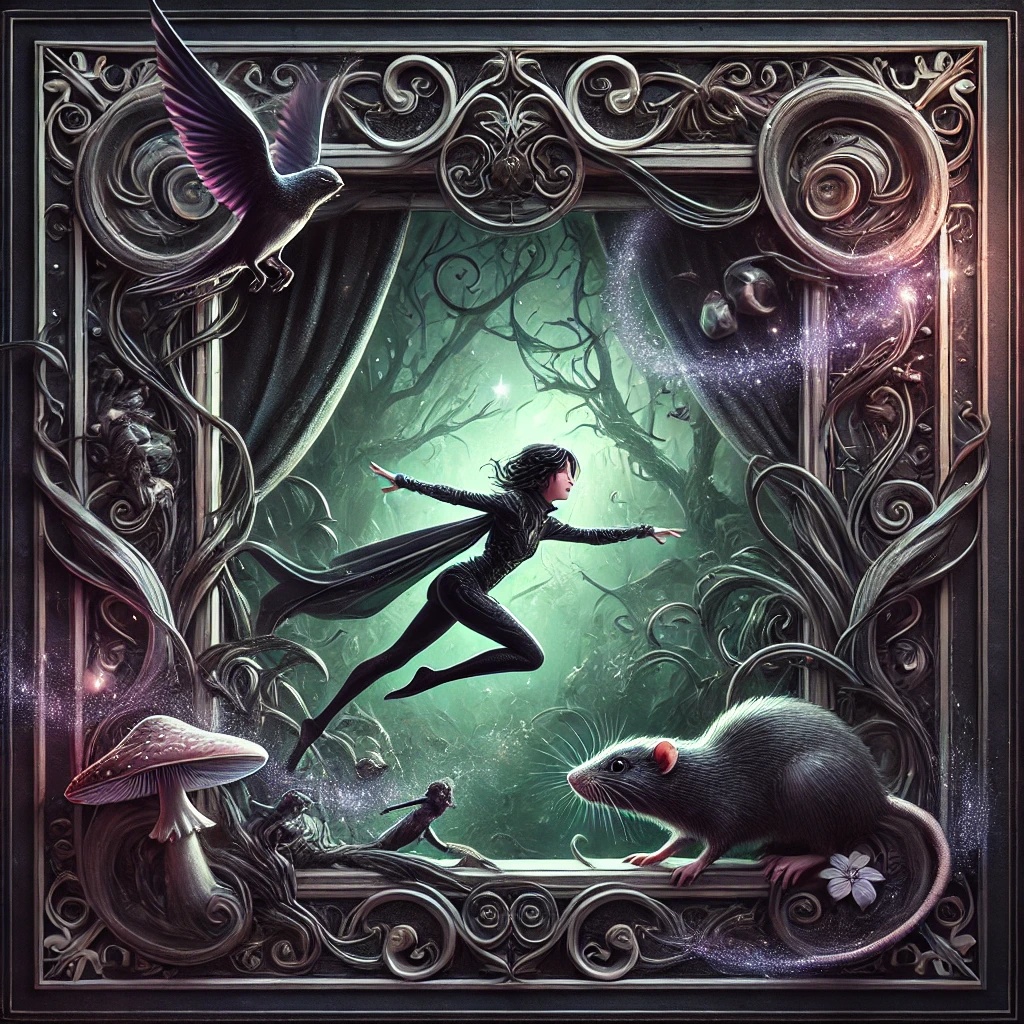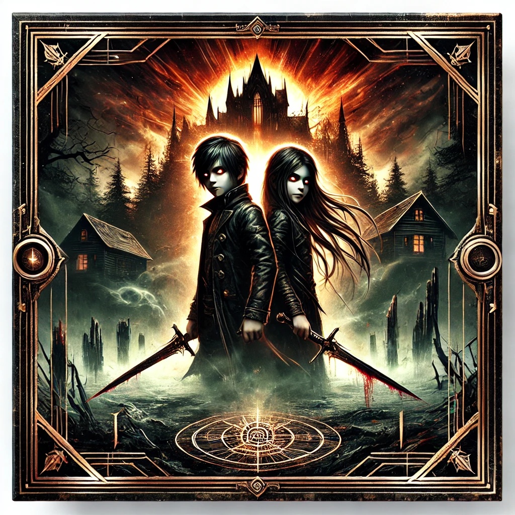 Dark fairy tale vibe, distorted guitars, ambient strings, deep bass, chaotic drums, eerie synths, raspy male vocals, haunting female echoes, mystic energy, layered harmonies, tense percussion, dramatic drops