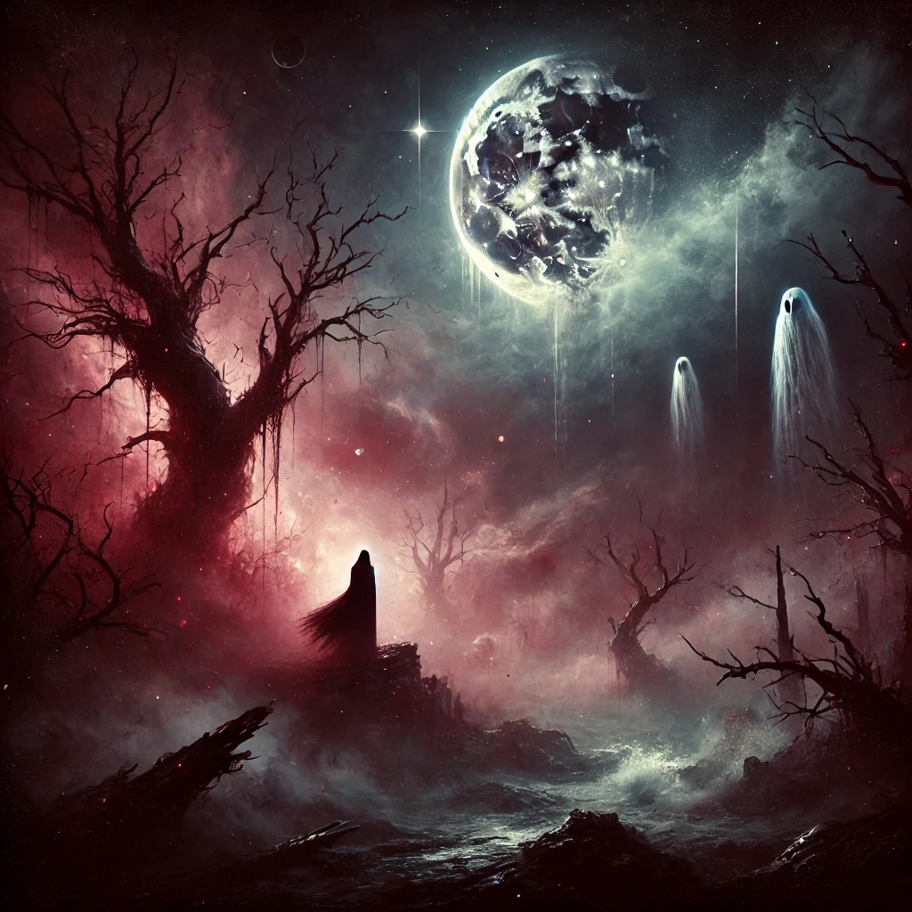 Haunting guitar arpeggios, deep synth drones, mournful bass, eerie echoes, ethereal pads, ghostly whispers, melancholic vocals, soft reverb, subtle delays, hypnotic rhythms, cinematic swells, dreamlike atmospher
