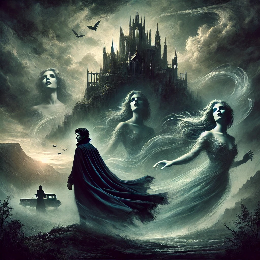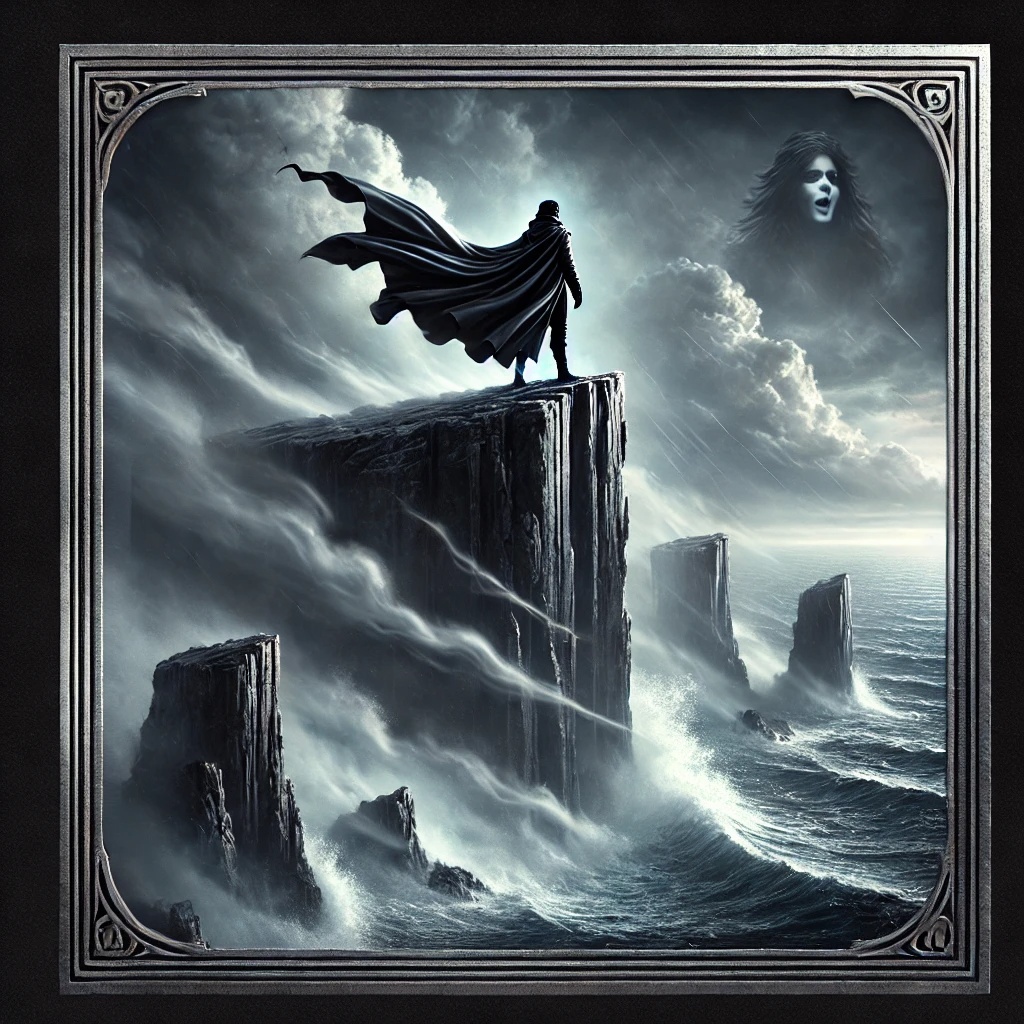 Dark gothic rock, thunderous drums, deep distorted bass, haunting violins, whispered echoes, ritualistic chants, ethereal vocals, cinematic strings, ominous bells, ghostly choirs, crashing cymbals, eerie wind, tr