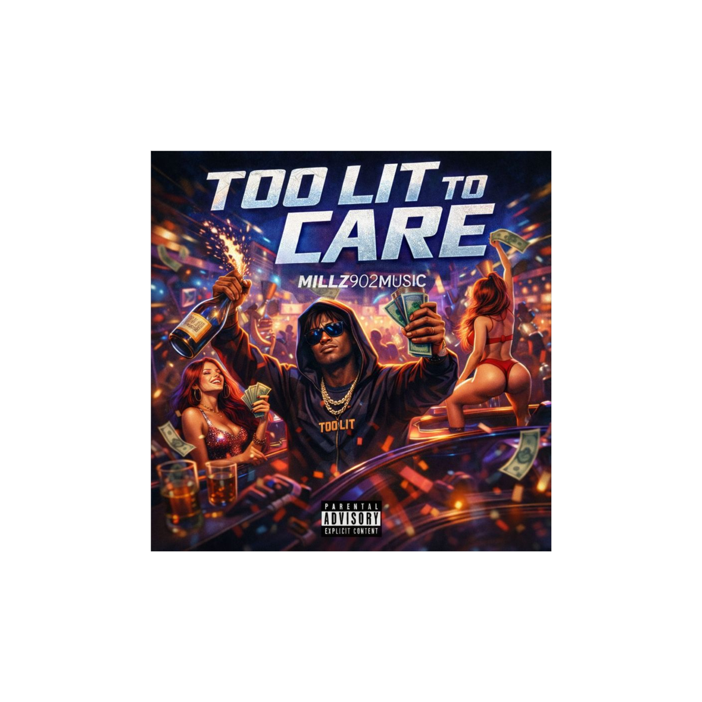 High-energy trap / club rap with heavy 808s, aggressive bass, and punchy modern drums, Fast tempo with reckless nightlife energy, Confident male rap delivery with hyped ad-libs, crowd-chant hooks, and bold call-and-response moments, Lyrics focused on being too lit to care, bottles popping, girls dancing, money flashing, fake love ignored, ego loud, attention everywhere, Dark but flashy club atmosphere, late-night chaos, unapologetic confidence, catchy hooks, No emotional vulnerability, No rock, no country, no pop softness, Designed for party speakers, clubs, and car systems at max volume, Bronx-influenced bounce playful chaotic flow switches female feature with confident bounce delivery