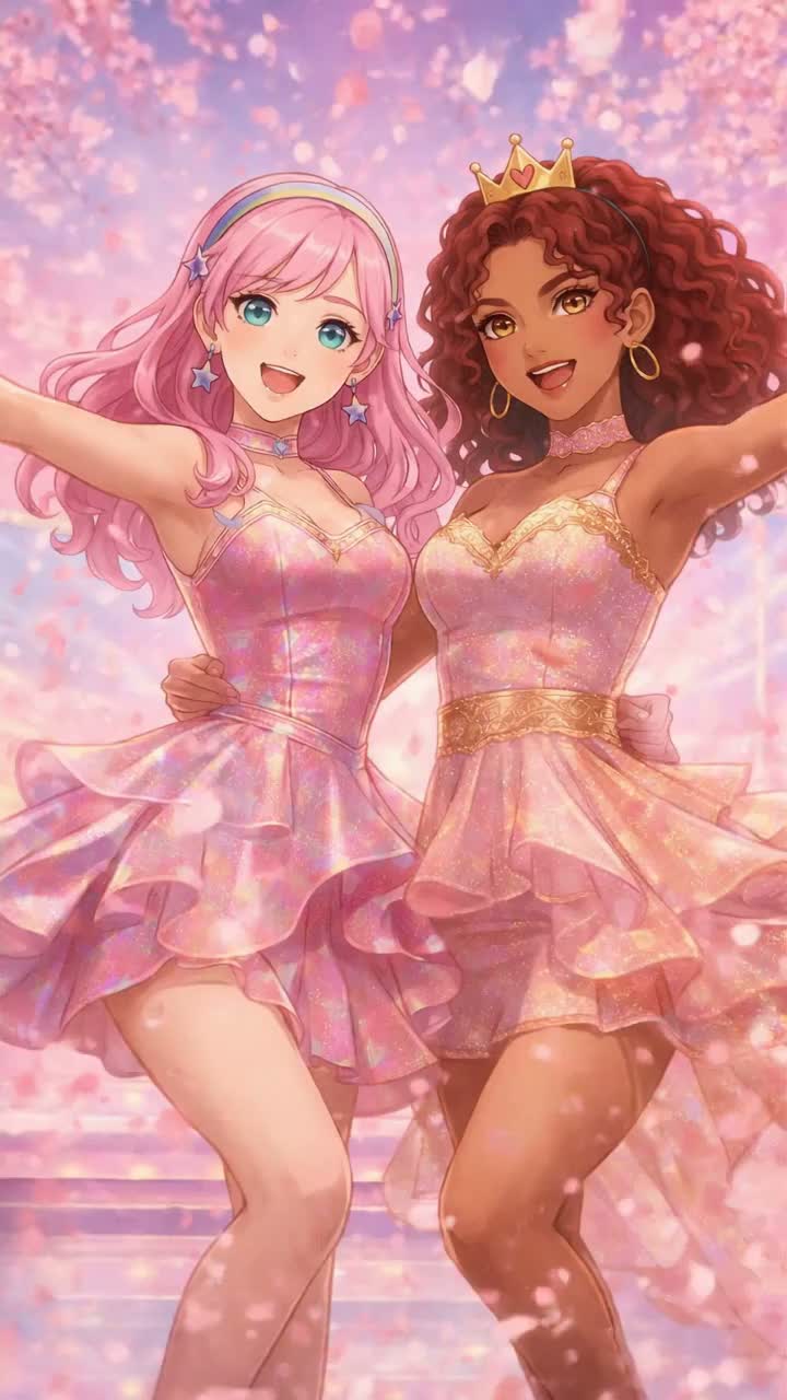 Bright electropop + vibrant synthpop with Japanese traditional fusion, BPM ~128, Use koto arpeggios, fue melodies, shamisen rhythmic plucks, taiko drums for impact, glittery synths, warm bass, punchy pop drums, “Sakura petals” shimmering FX, Bright, colorful, energetic, festival-spring vibe, Vocals: Iona (mezzo-soprano, powerful, bright, clean belting, center-tone, crisp projection), Kariné (soprano leve, cute-power elegante, cristalina, airy, sweet, falsetto top harmonies), Big modern K-pop chorus, catchy hooks, dreamy bridge with koto, explosive final drop, Floral, rosa, cinematográfico