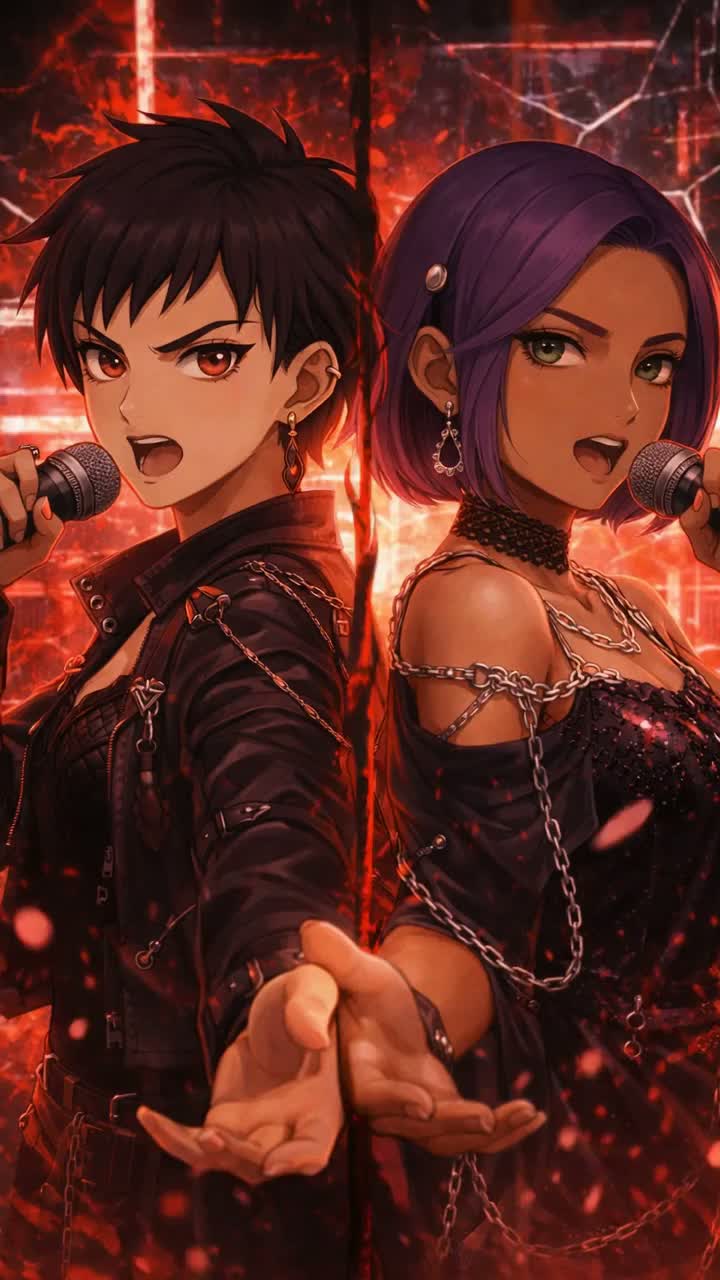 Duet, Two Vocalists, Dark electro-pop + alt-rock intensity, Heavy seismic percussion, metallic hits, deep sub-bass tremor pulses, Tense minimal verse → explosive chorus, Distorted guitars, serrated synths, glitch accents, earthquake-like impacts, Cinematic tension, aggressive drops, atmospheric whispers, Vocals: Virel (mezzo-contralto, dark, emotional, chesty, textured, tense whisper, controlled fry, low smoky tone) + Eirys (bright soprano, sharp metallic highs, clean belts, urgent pre-chorus, crystalline vibrato), Chorus = layered contrast: low growl + high belt, Bridge atmospheric with heartbeat FX, Final drop heavy, dramatic, tectonic, Mood: collision, rupture, red energy