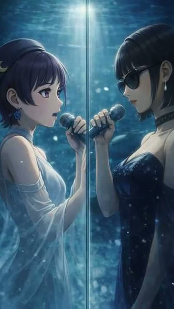 K-Pop + Dark fantasy waltz + theatrical jazz cabaret, BPM: ~100 BPM, Duration: 4 minutes, Moody, cinematic, underwater cabaret atmosphere, Instrumentation: jazz piano, upright bass, brushed drums, soft sax, low strings, ambient water textures, bubble sounds, heavy reverb and delay, Emotional contrast duet, Vocals: